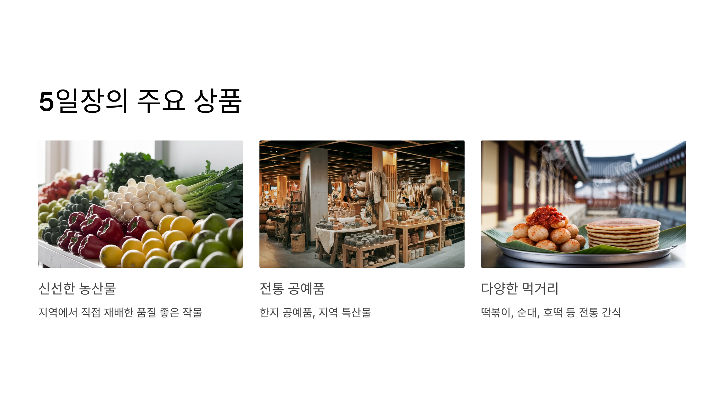 5일장은 지역 경제를 활성화하는 중요한 역할을 합니다. 지역 상인들의 생계를 지원하고, 지역 특산물의 판매를 촉진합니다.