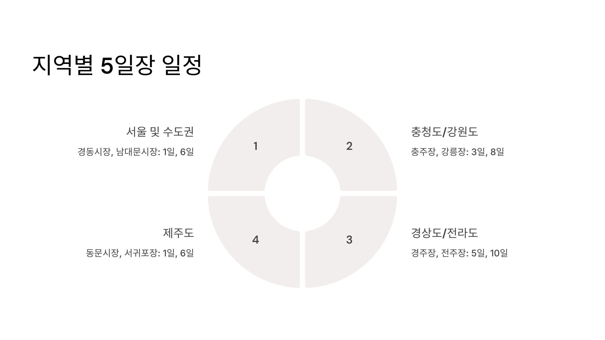 전국5일장은 매 5일마다 열리며, 각 지역마다 고유의 날짜와 장소에서 운영됩니다. 예를 들어, A 지역은 1일과 6일, B 지역은 2일과 7일에 열리는 식입니다. 이러한 일정은 지역 주민들이 서로 다른 장터를 이용할 수 있도록 조정된 것입니다.