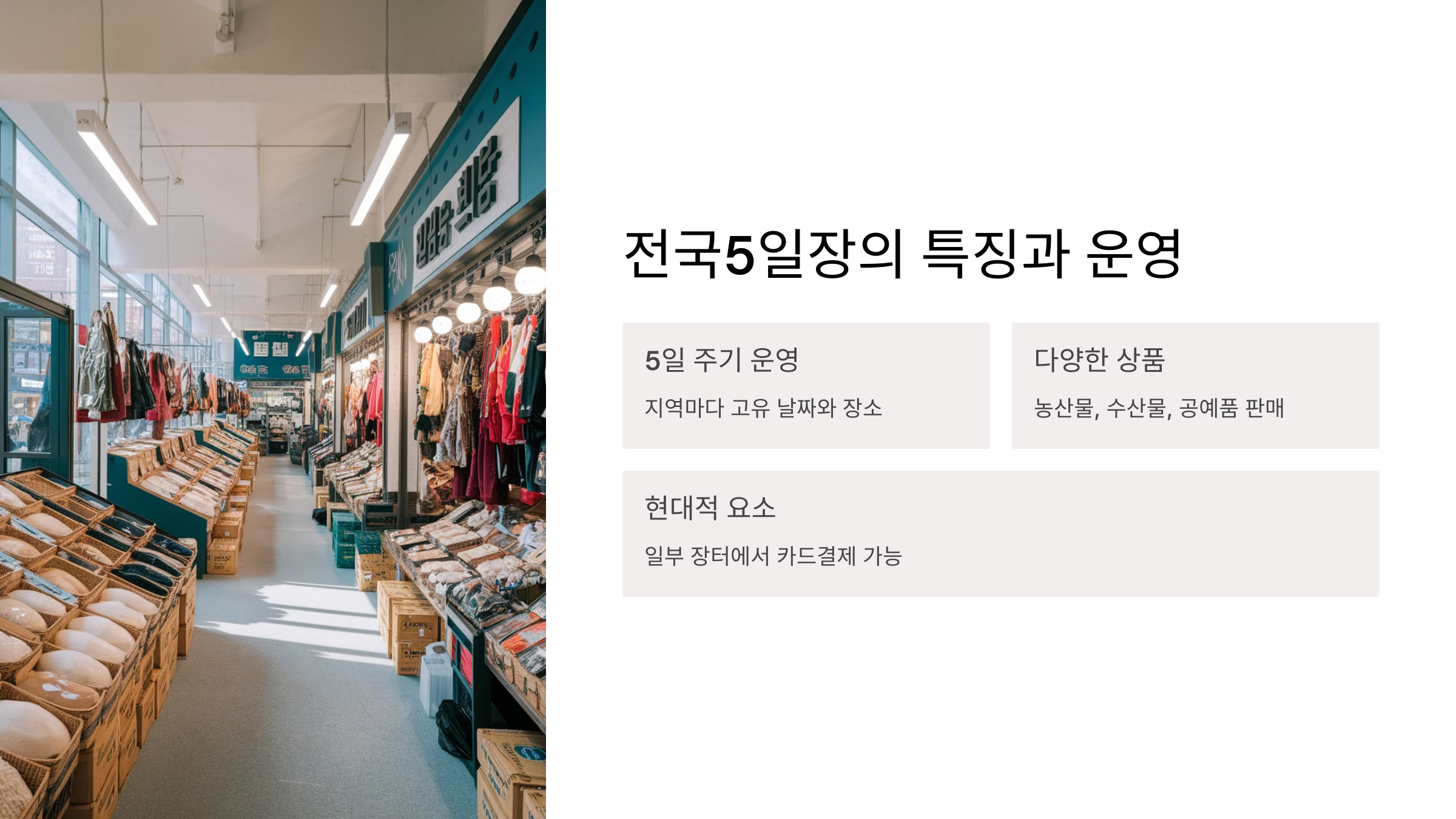 전국 곳곳에서 열리는 전국5일장은 우리나라 전통 시장 문화의 중심입니다. 매 5일마다 열리는 이 장터는 지역 주민과 상인들이 모여 다양한 상품을 사고파는 공간으로, 현대에도 여전히 많은 사랑을 받고 있습니다. 이번 글에서는 전국5일장의 유래부터 장날 날짜 확인 방법, 주요 일정, 그리고 방문 팁까지 상세히 정리해보겠습니다.