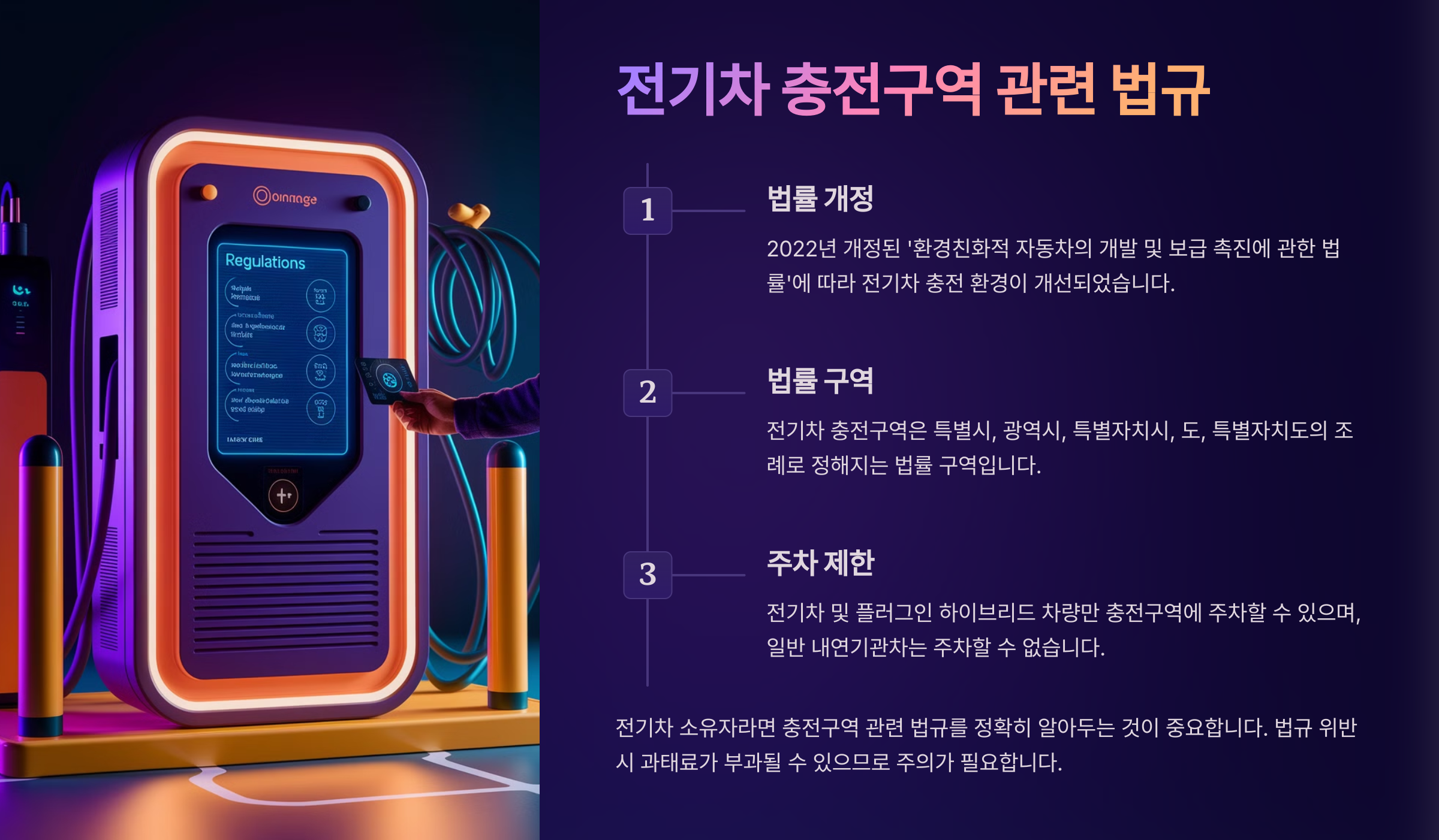 전기차 소유자라면 충전구역 관련 법규를 정확히 알아두는 것이 중요합니다. 2022년 개정된 '환경친화적 자동차의 개발 및 보급 촉진에 관한 법률'에 따라 전기차 충전 환경이 개선되었지만, 법규 위반 시 과태료가 부과될 수 있습니다. 전기차 충전구역은 특별시, 광역시, 특별자치시, 도, 특별자치도의 조례로 정해지는 법률 구역입니다.