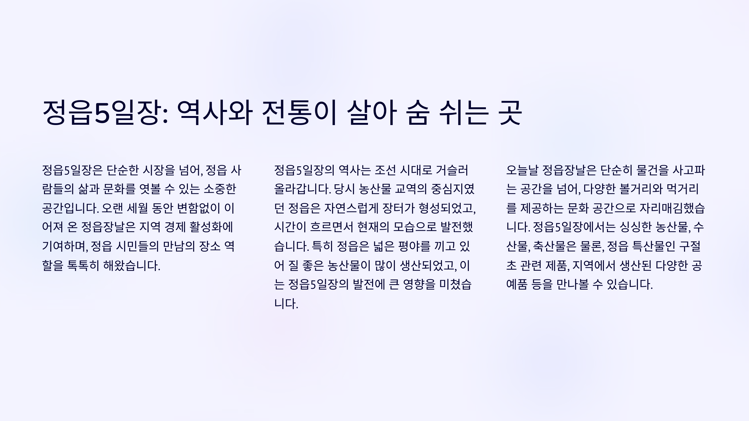 | 시장 풍경 | 다양한 상품을 판매하는 상인들과 물건을 사러 온 사람들로 북적임 | 정읍 사람들의 삶을 엿볼 수 있는 기회 |