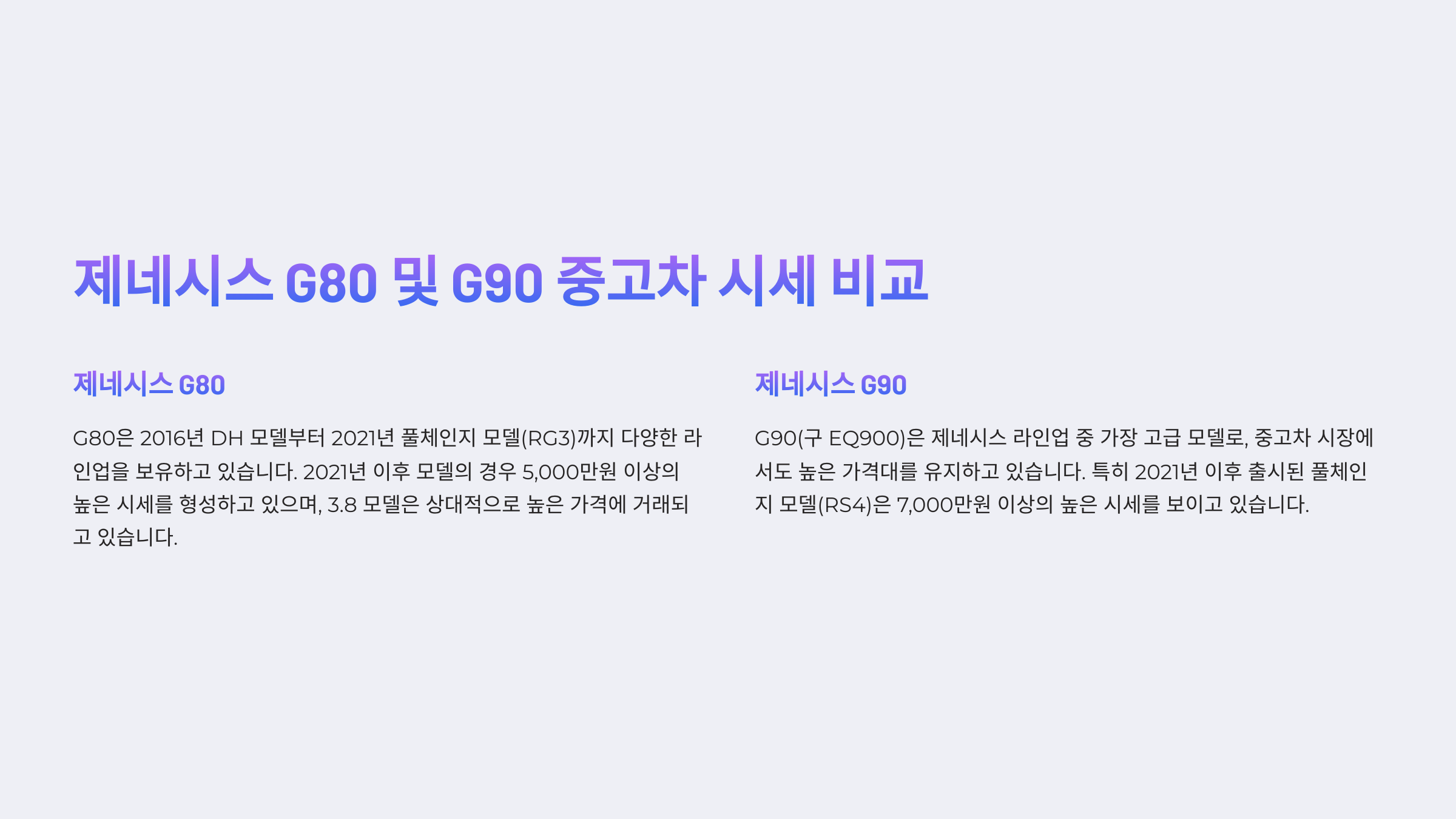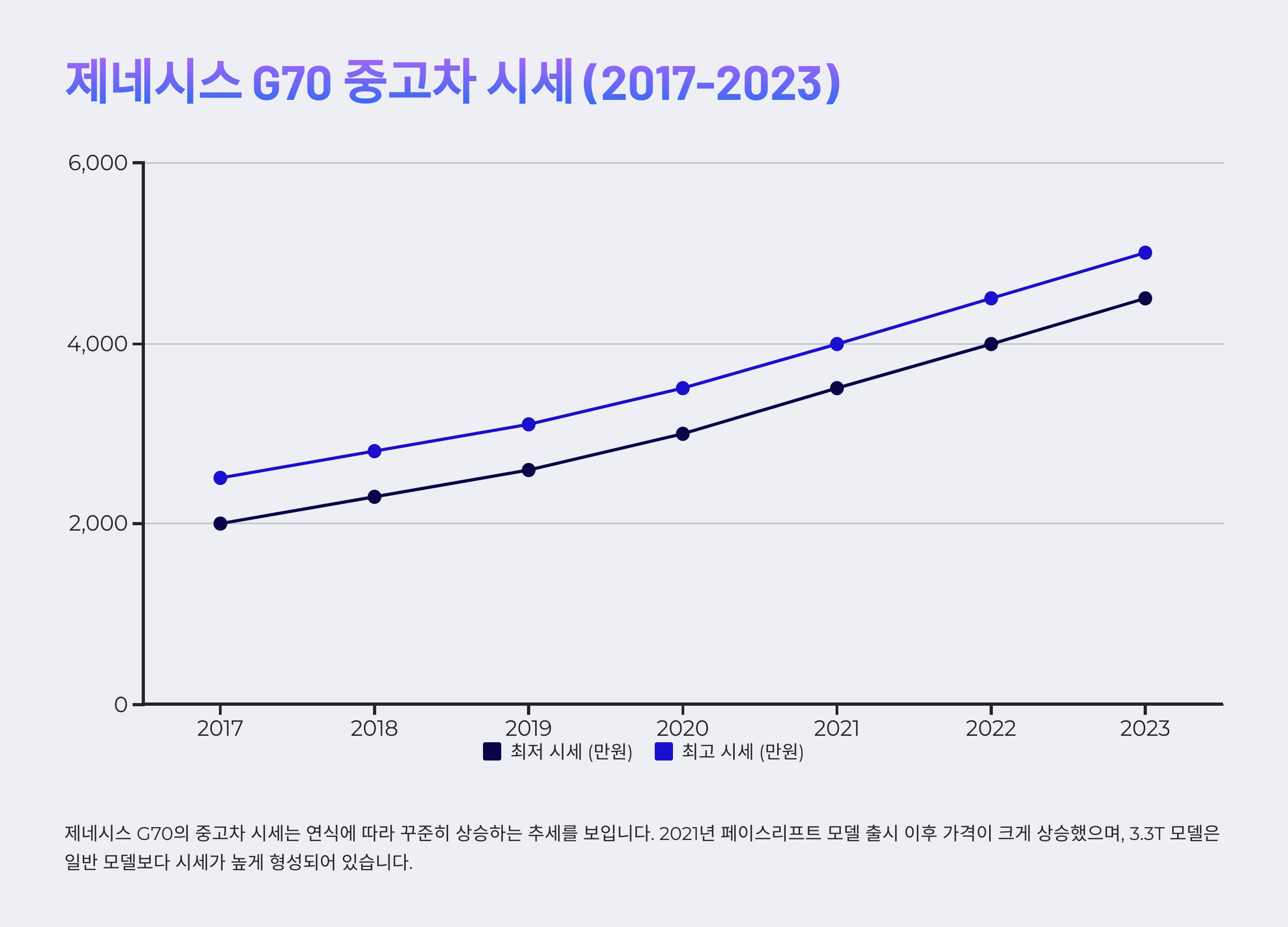 - 모델 및 트림: 제네시스에는 다양한 모델(G70, G80, G90 등)과 트림이 존재합니다. 고급 트림일수록, 희소성이 높은 모델일수록 가격은 높아지는 경향이 있습니다.