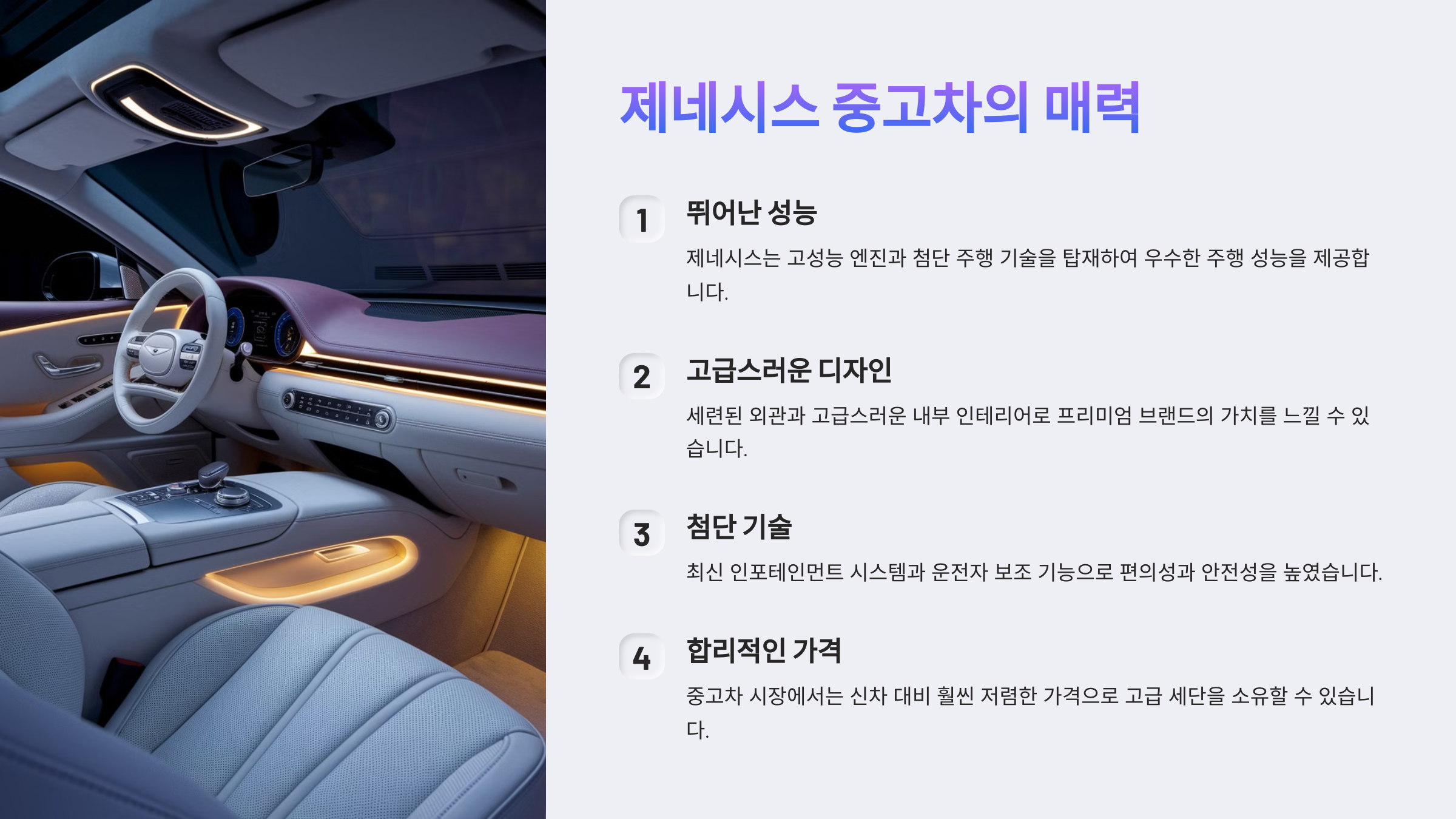 제네시스는 뛰어난 성능, 고급스러운 디자인, 그리고 다양한 첨단 기술을 자랑합니다. 신차 가격은 높은 편이지만, 중고차 시장에서는 합리적인 가격으로 구매할 수 있다는 장점이 있습니다. 특히 감가상각이 어느 정도 진행된 모델은 신차 대비 훨씬 저렴하게 고급 세단을 소유할 수 있는 기회를 제공합니다. 또한, 제네시스는 내구성이 뛰어나 유지보수 측면에서도 만족도가 높아, 중고차 시장에서 꾸준한 인기를 얻고 있습니다.