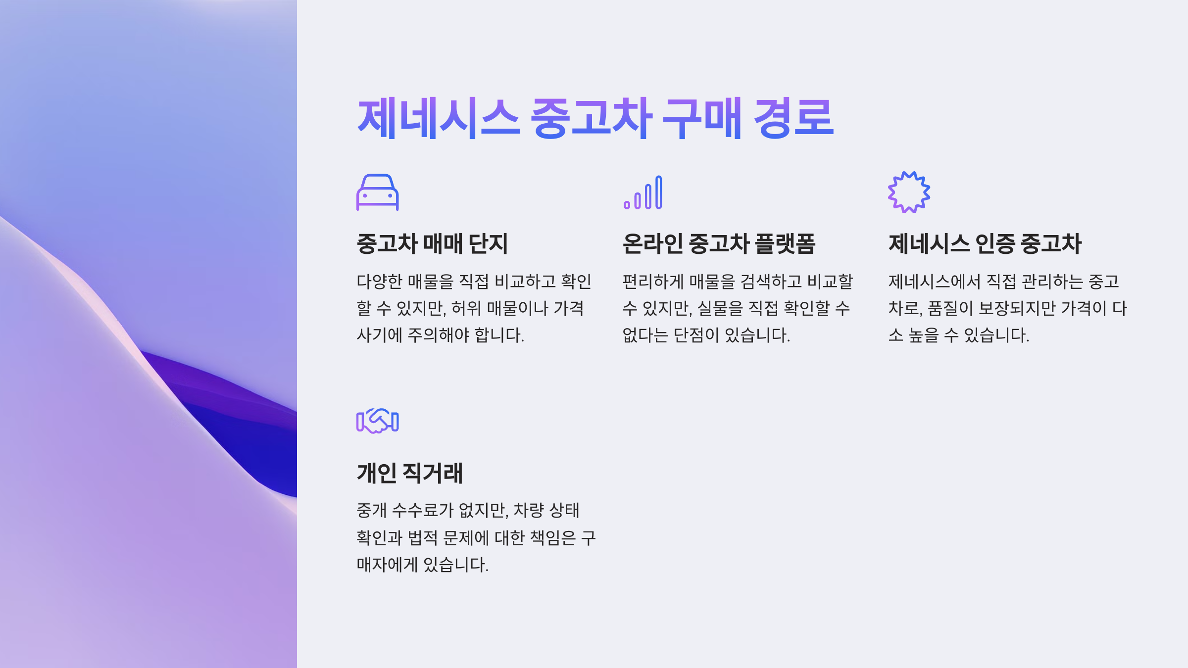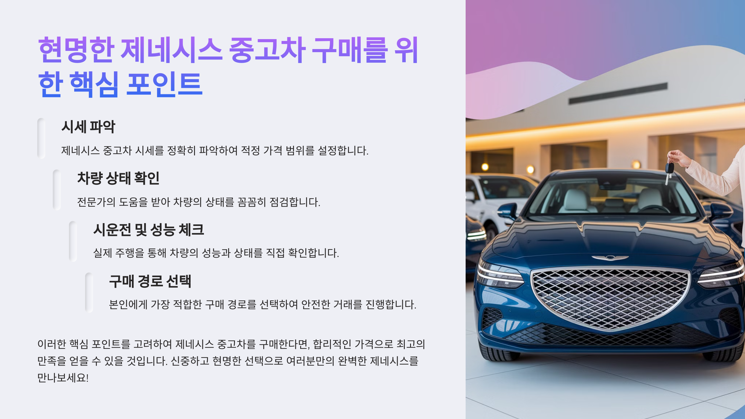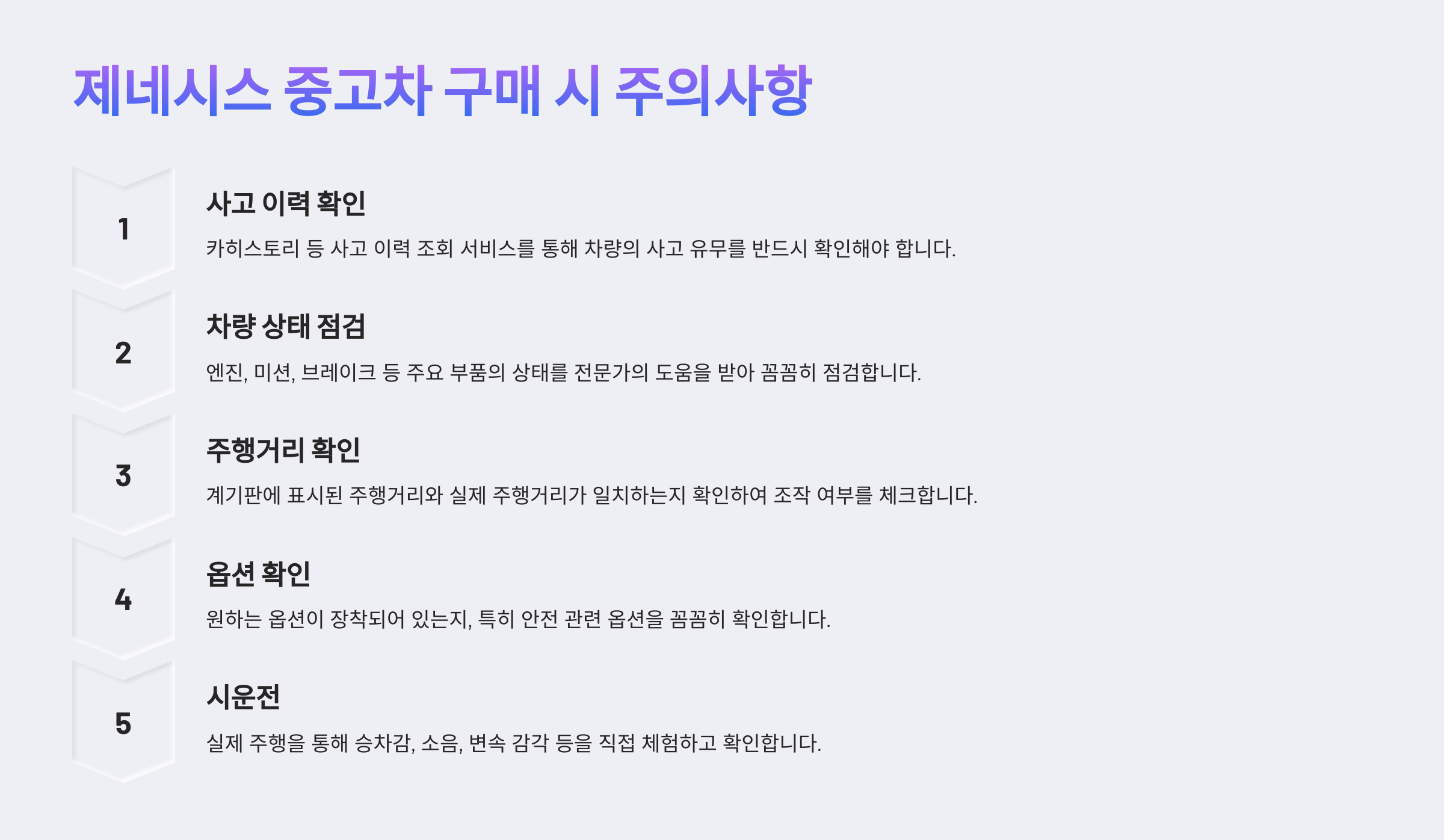 제네시스 중고차를 구매할 때는 다음과 같은 사항에 유의해야 합니다.