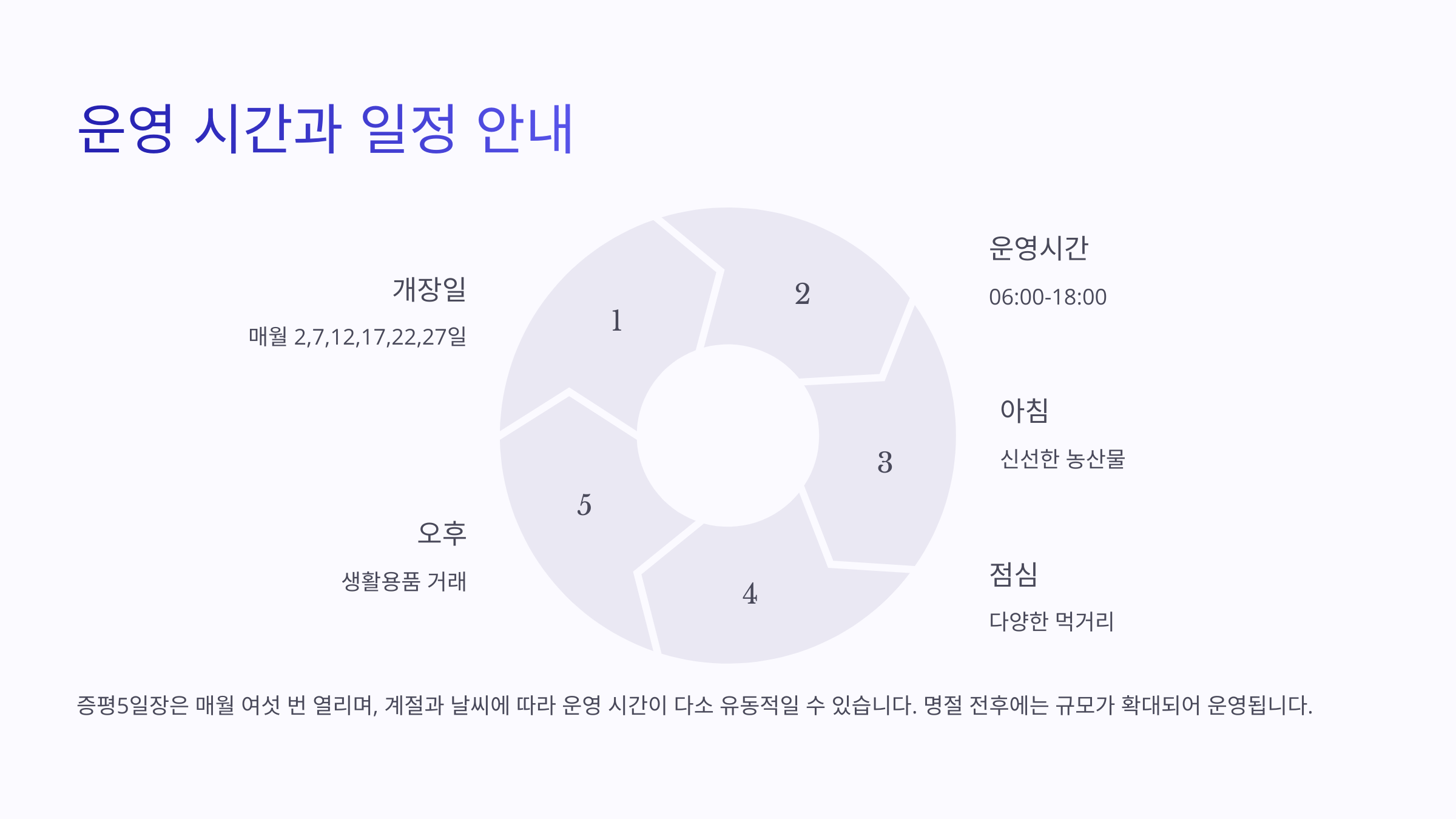 시간대별 품목 | 아침-농산물, 점심-먹거리, 오후-생활용품 |