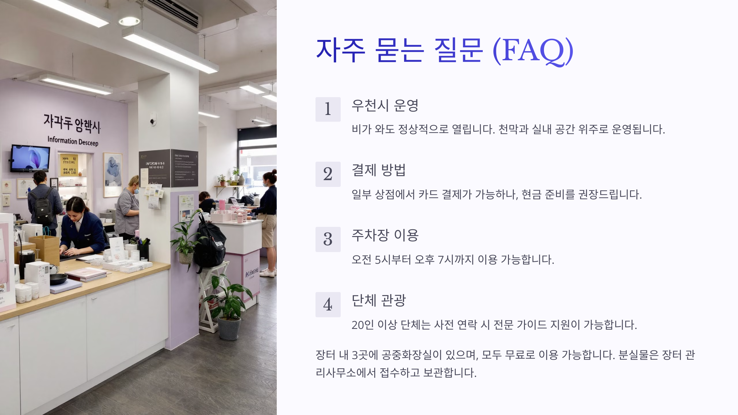 A: 우천시에도 장은 정상적으로 열립니다. 다만 천막과 실내 공간 위주로 운영됩니다.