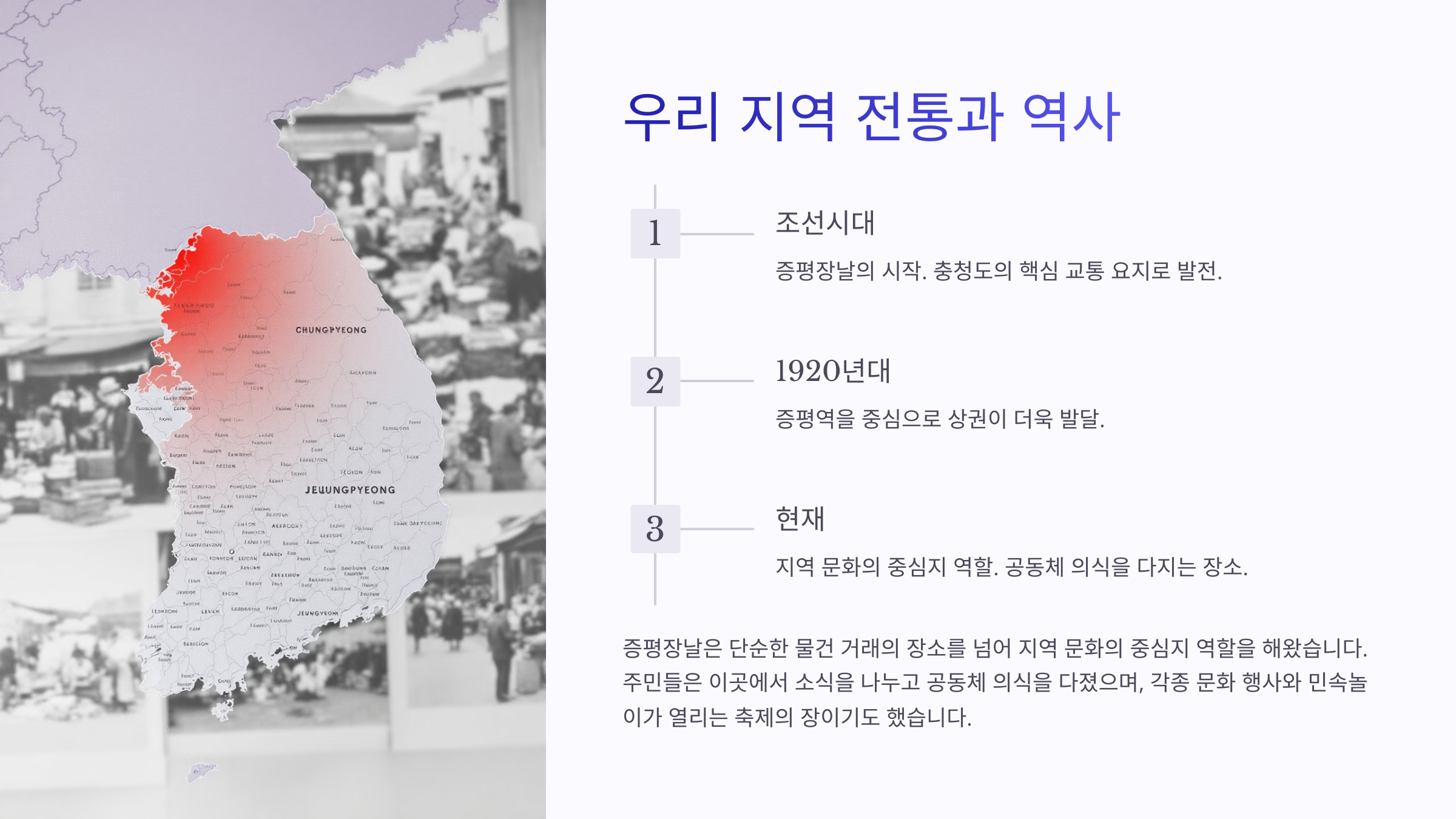 조선시대부터 이어져 온 증평장날은 충청도의 핵심 교통 요지였습니다. 각지에서 모여든 상인들이 물건을 거래하던 중요한 상업 중심지로서, 1920년대부터는 증평역을 중심으로 상권이 더욱 발달하였습니다.
