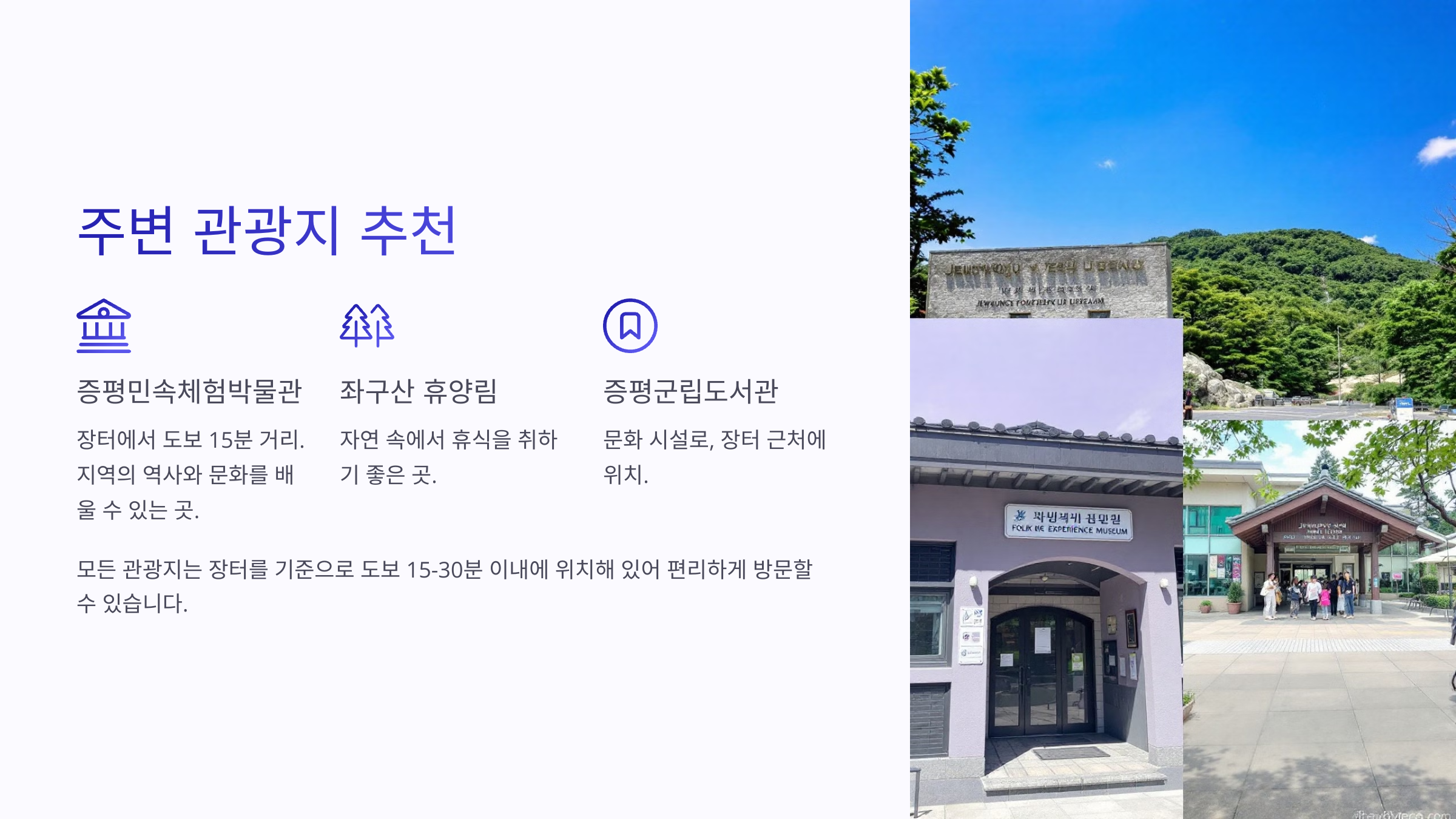 우리 지역의 명소인 증평오일장 주변에는 둘러볼 만한 관광지가 많습니다. 증평민속체험박물관은 장터에서 도보 15분 거리에 위치해 있으며, 지역의 역사와 문화를 배울 수 있습니다. 좌구산 휴양림은 자연 속에서 휴식을 취하기 좋은 곳입니다.