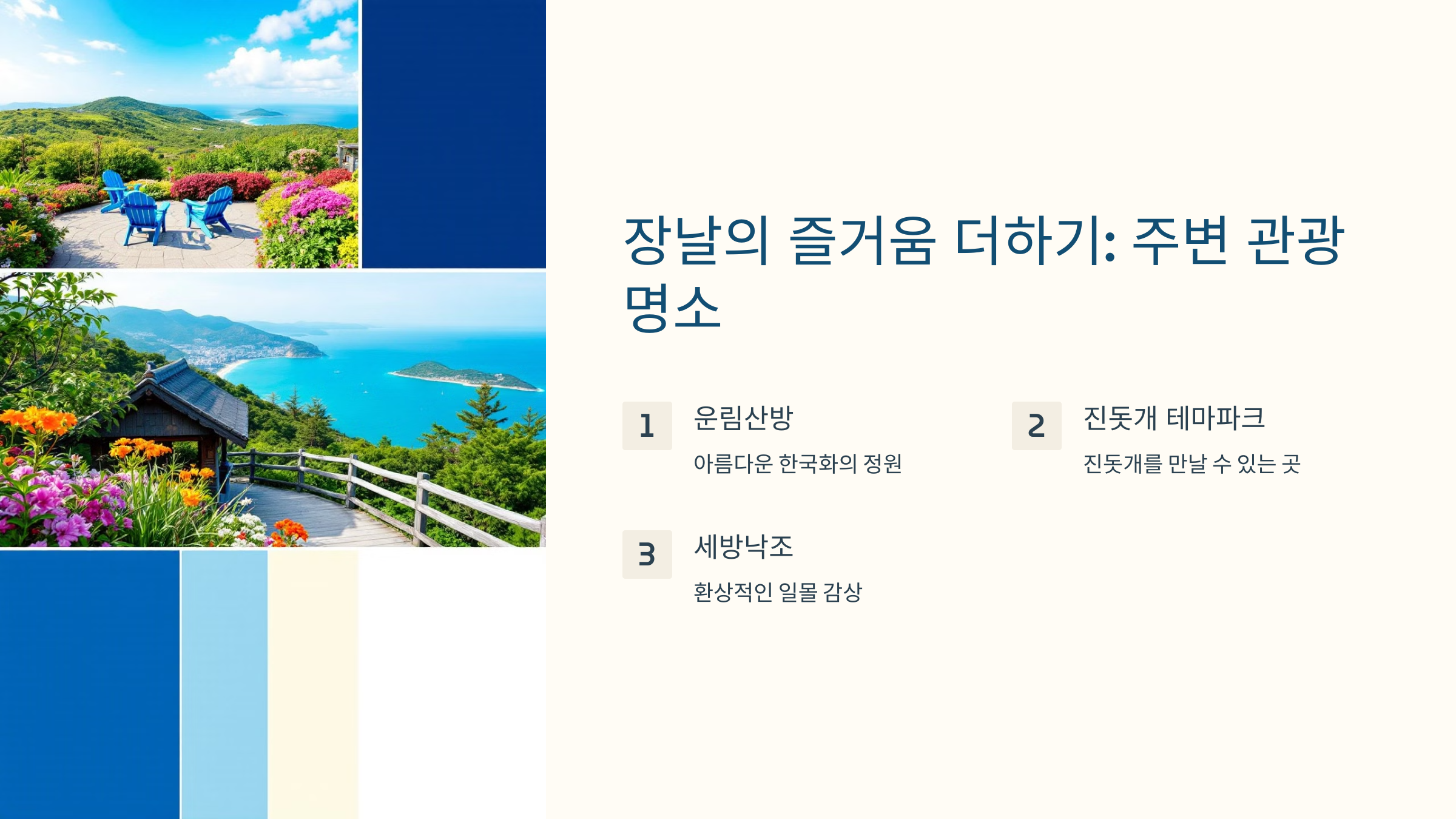 진도 오일장을 방문했다면, 근처에 있는 멋진 관광지도 함께 둘러보는 것이 좋아요. 진도는 아름다운 자연과 역사적인 명소가 많아서 하루 일정으로 다녀오기에 딱 좋아요! 🏞️