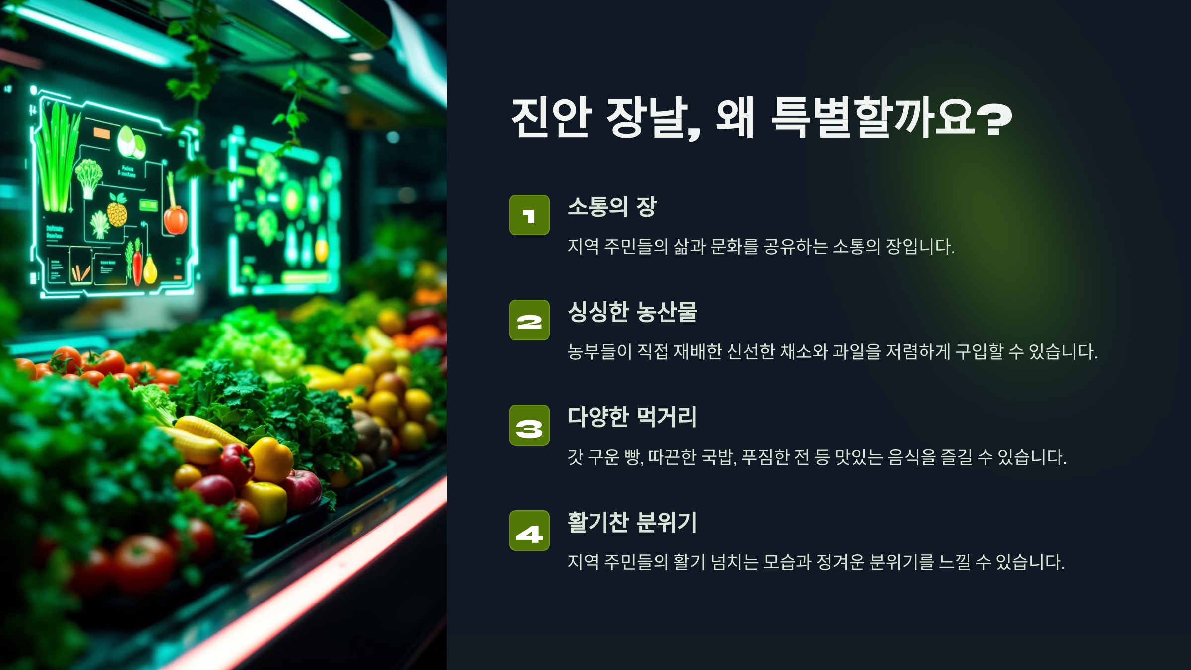 진안 장날은 단순히 물건을 사고파는 공간을 넘어, 지역 주민들의 삶과 문화를 공유하는 소통의 장입니다. 오랜 역사와 전통을 자랑하는 진안5일장은 진안군민뿐만 아니라 인근 지역 주민들에게도 사랑받는 곳입니다.