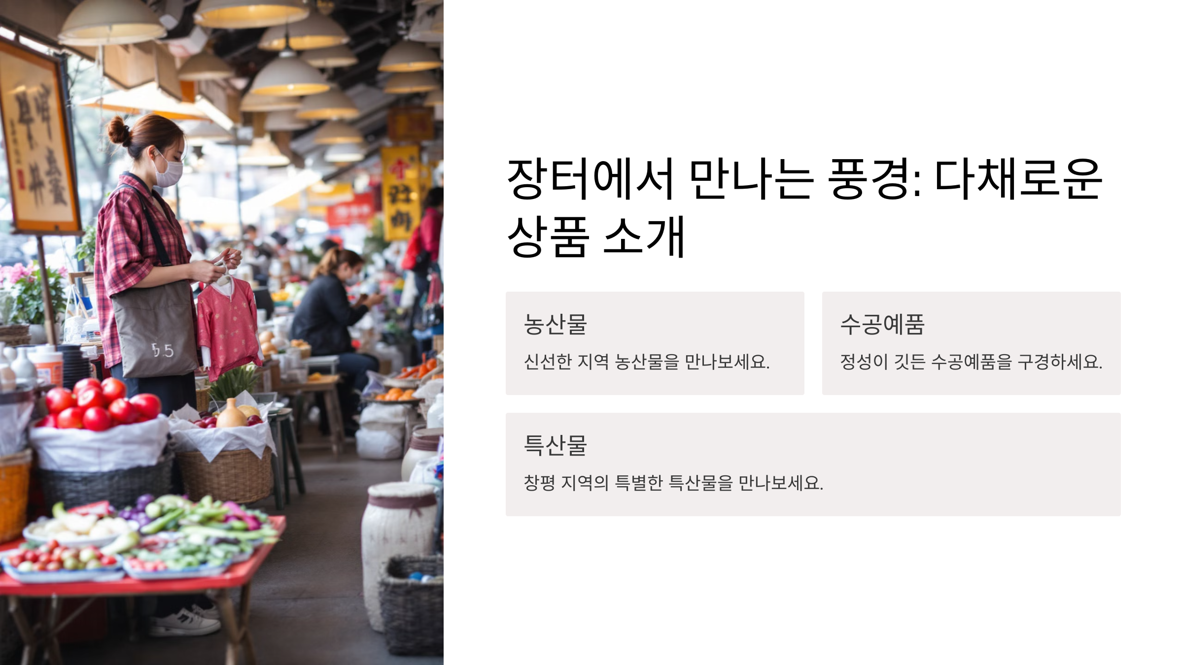 | 다양한 품목 | 농산물, 공예품, 전통 먹거리 판매 |