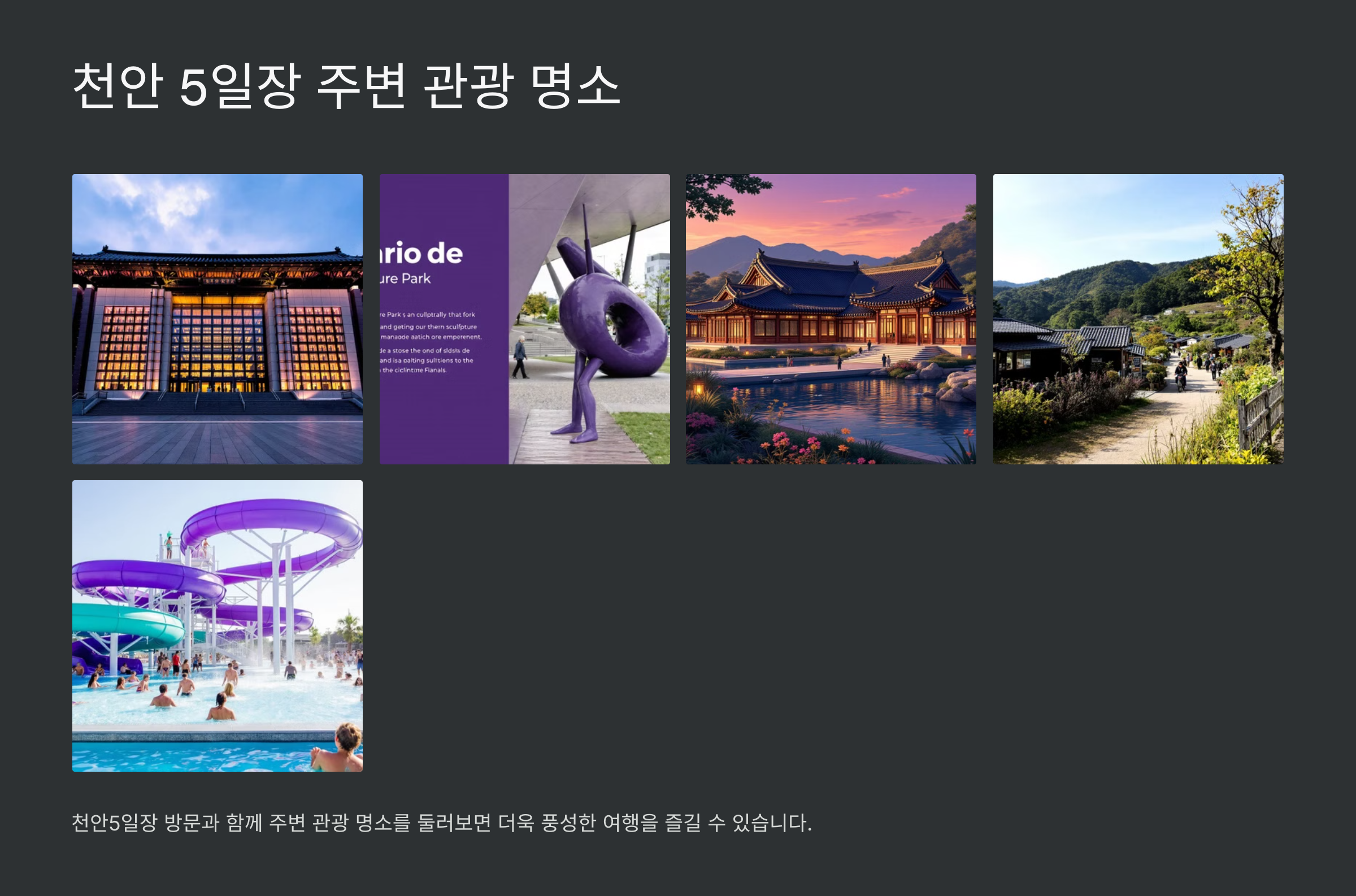 천안5일장 방문과 함께 주변 관광 명소를 방문하면 더욱 풍성한 여행을 즐길 수 있습니다.