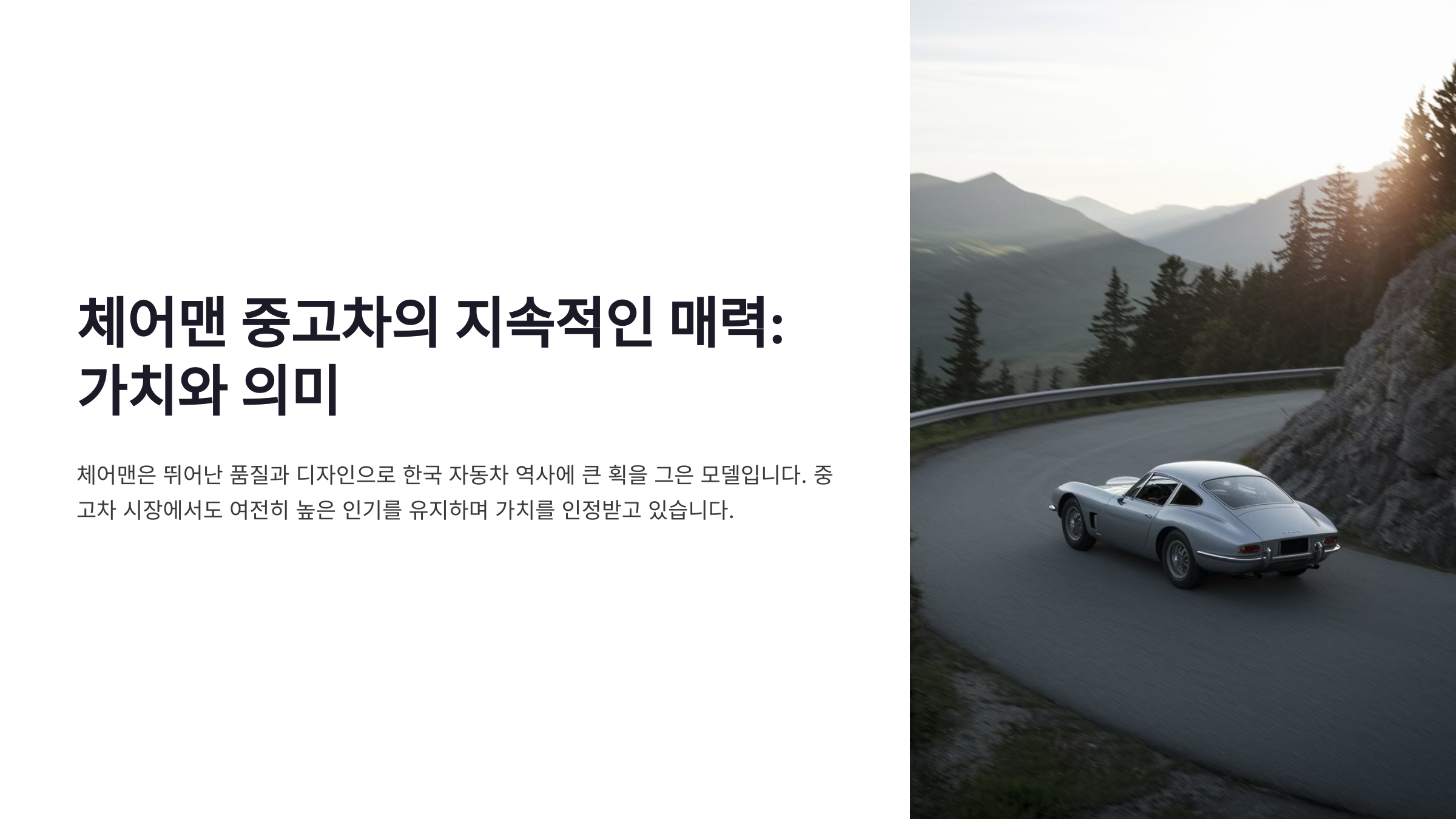 체어맨은 한때 대한민국을 대표하는 최고급 세단으로서, 뛰어난 승차감과 묵직한 안정감, 그리고 고급스러운 디자인으로 많은 이들의 드림카였습니다. 시간이 흘러 최신 기술이 적용된 차량들이 쏟아져 나오지만, 체어맨만의 클래식한 매력은 여전히 유효합니다. 넉넉한 실내 공간과 안락한 시트는 장거리 운전에도 피로감을 덜어주며, 튼튼한 차체는 안전에 대한 믿음을 줍니다. 또한, 비교적 저렴한 가격으로 고급 세단을 소유할 수 있다는 점도 체어맨 중고차의 큰 장점입니다.