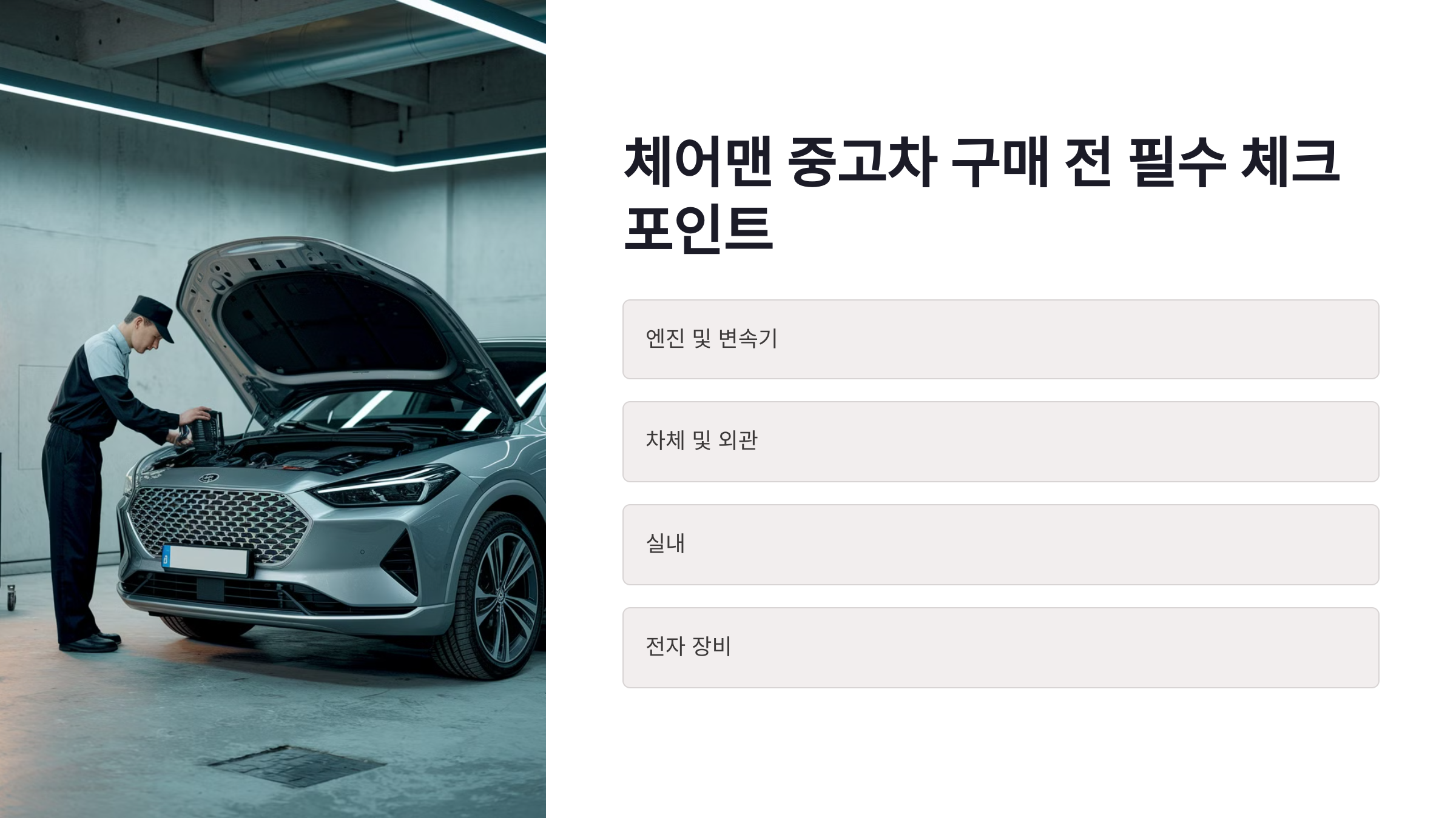 - 차량 상태 점검: 차량의 상태를 꼼꼼하게 점검해야 합니다. 엔진, 미션, 하체 등의 상태를 확인하고, 시운전을 통해 이상 유무를 확인해야 합니다.