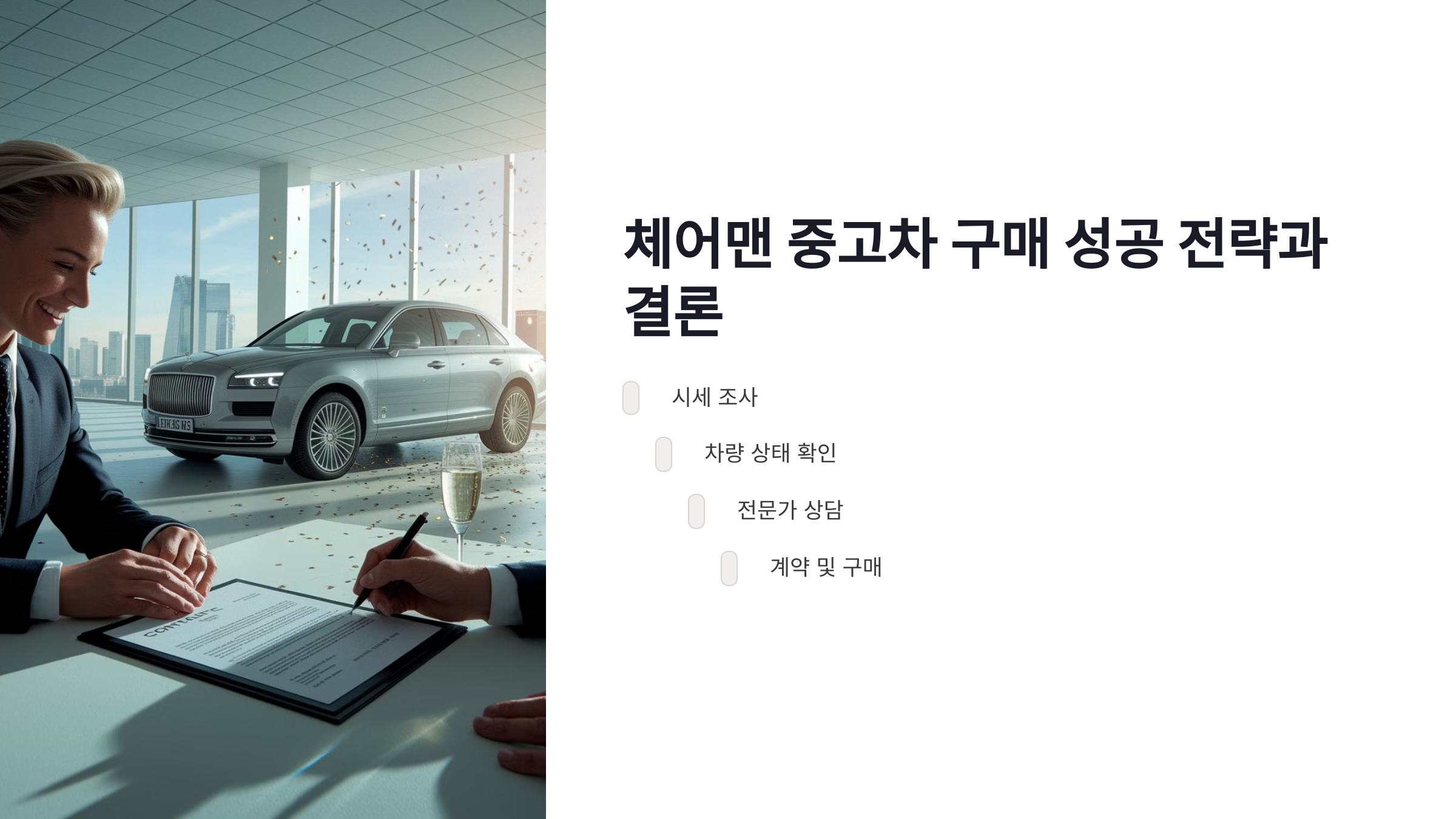 체어맨 중고차 구매는 꼼꼼한 준비와 정보 수집을 통해 만족스러운 결과를 얻을 수 있습니다. 이 글이 체어맨 중고차 구매에 도움이 되기를 바랍니다.