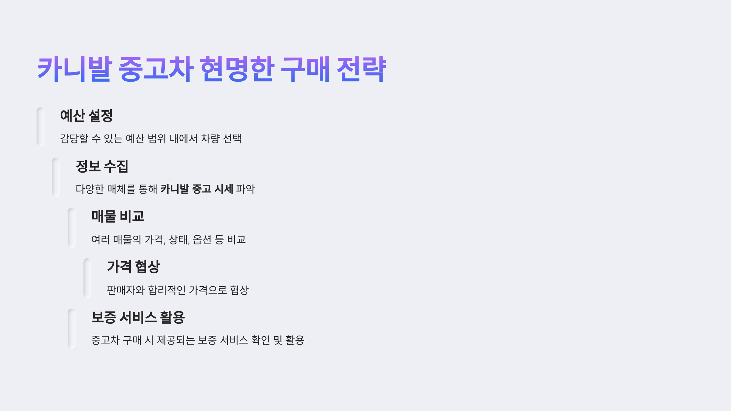 카니발 중고 가격을 합리적으로 책정하고, 좋은 상태의 차량을 구매하기 위해서는 몇 가지 전략이 필요합니다.
