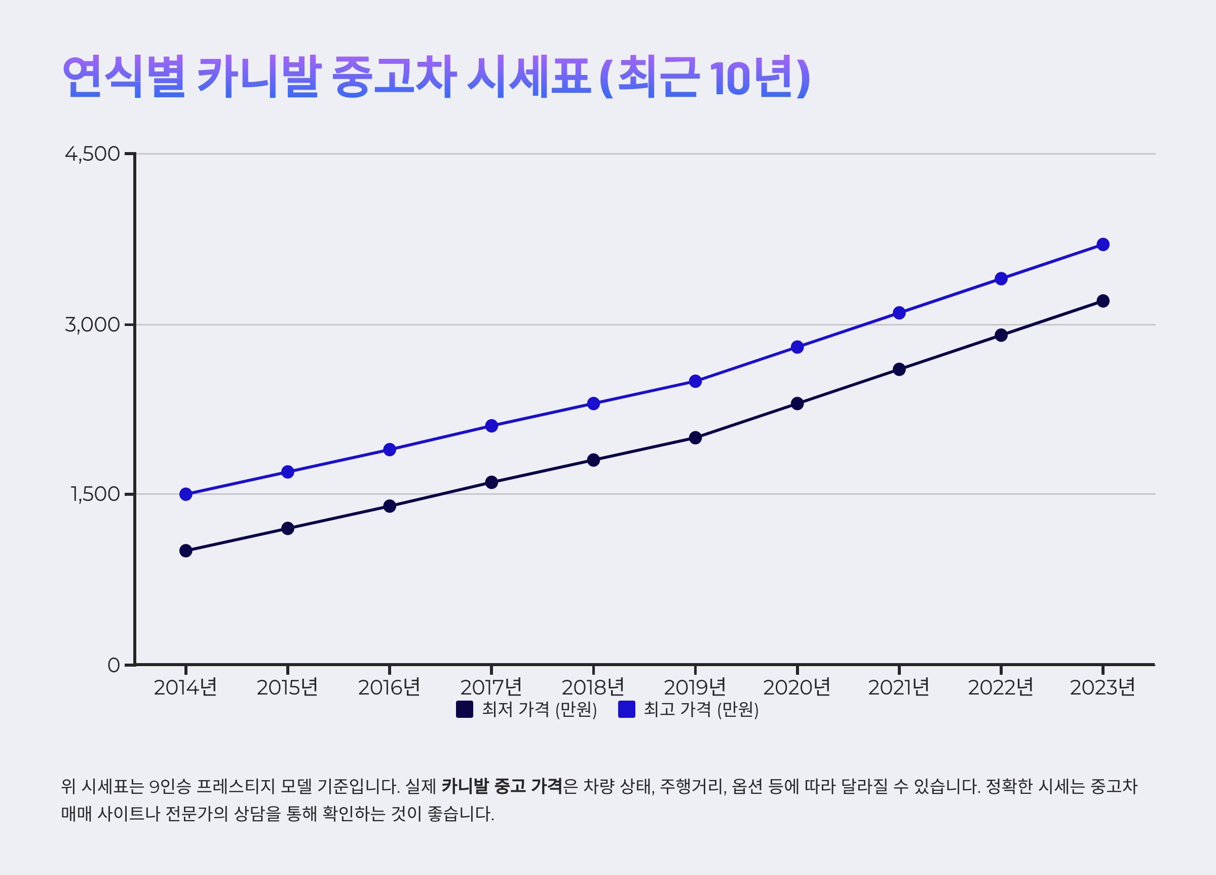 주의: 아래 시세표는 일반적인 참고 자료이며, 실제 카니발 중고 가격은 차량 상태, 주행거리, 옵션 등에 따라 달라질 수 있습니다. 정확한 카니발 중고 시세는 중고차 매매 사이트나 전문가의 상담을 통해 확인하는 것이 좋습니다.