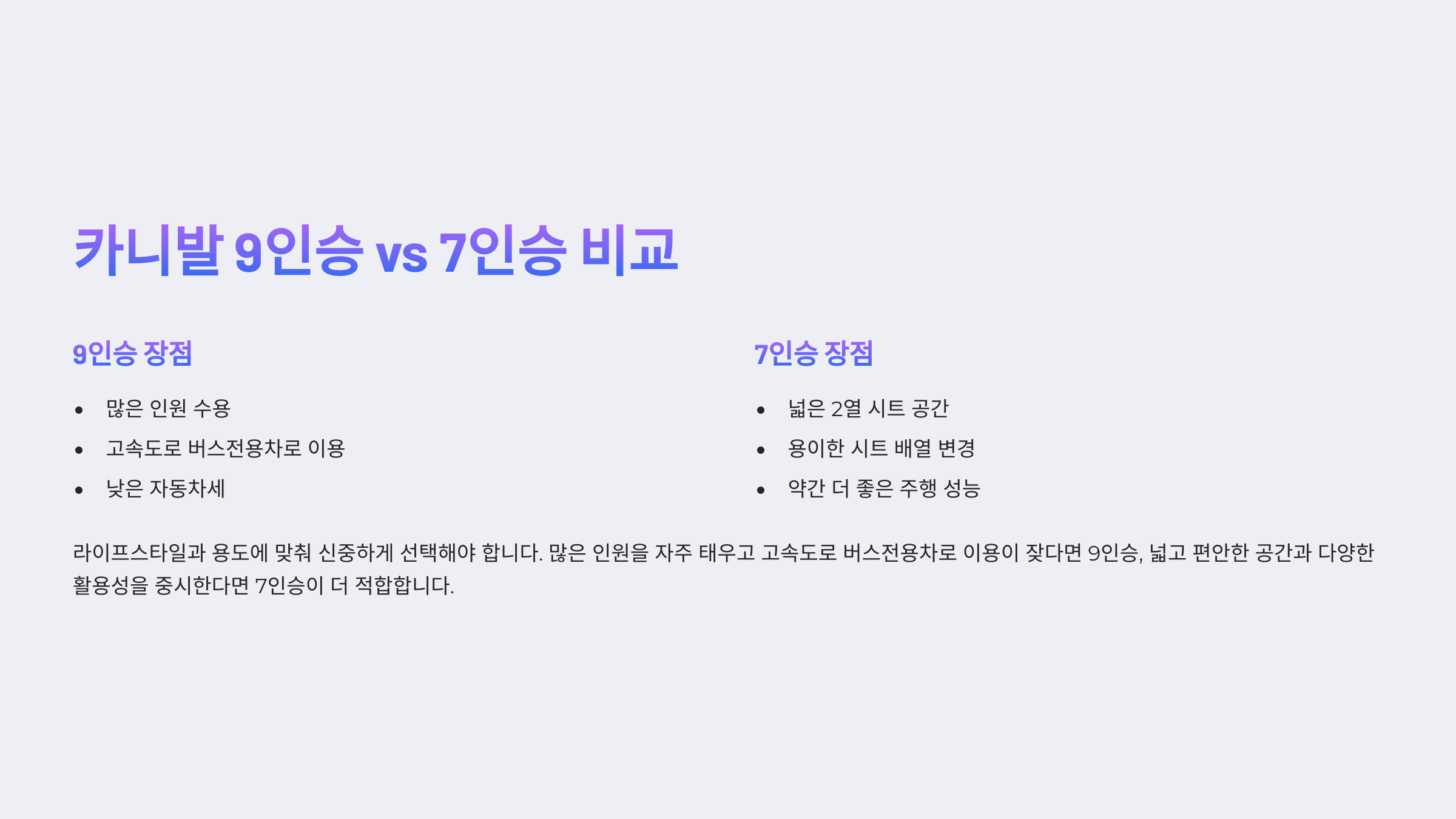 결론적으로, 많은 인원을 자주 태우고 고속도로 버스전용차로 이용이 잦다면 9인승 모델이, 넓고 편안한 공간과 다양한 활용성을 중시한다면 7인승 모델이 더 적합합니다.