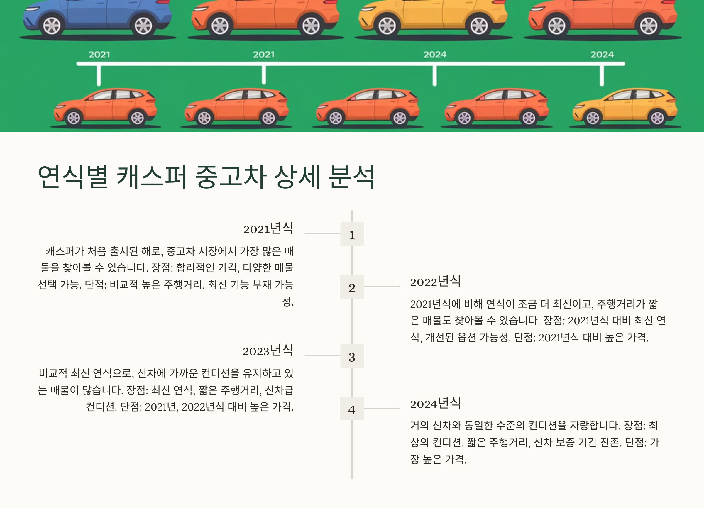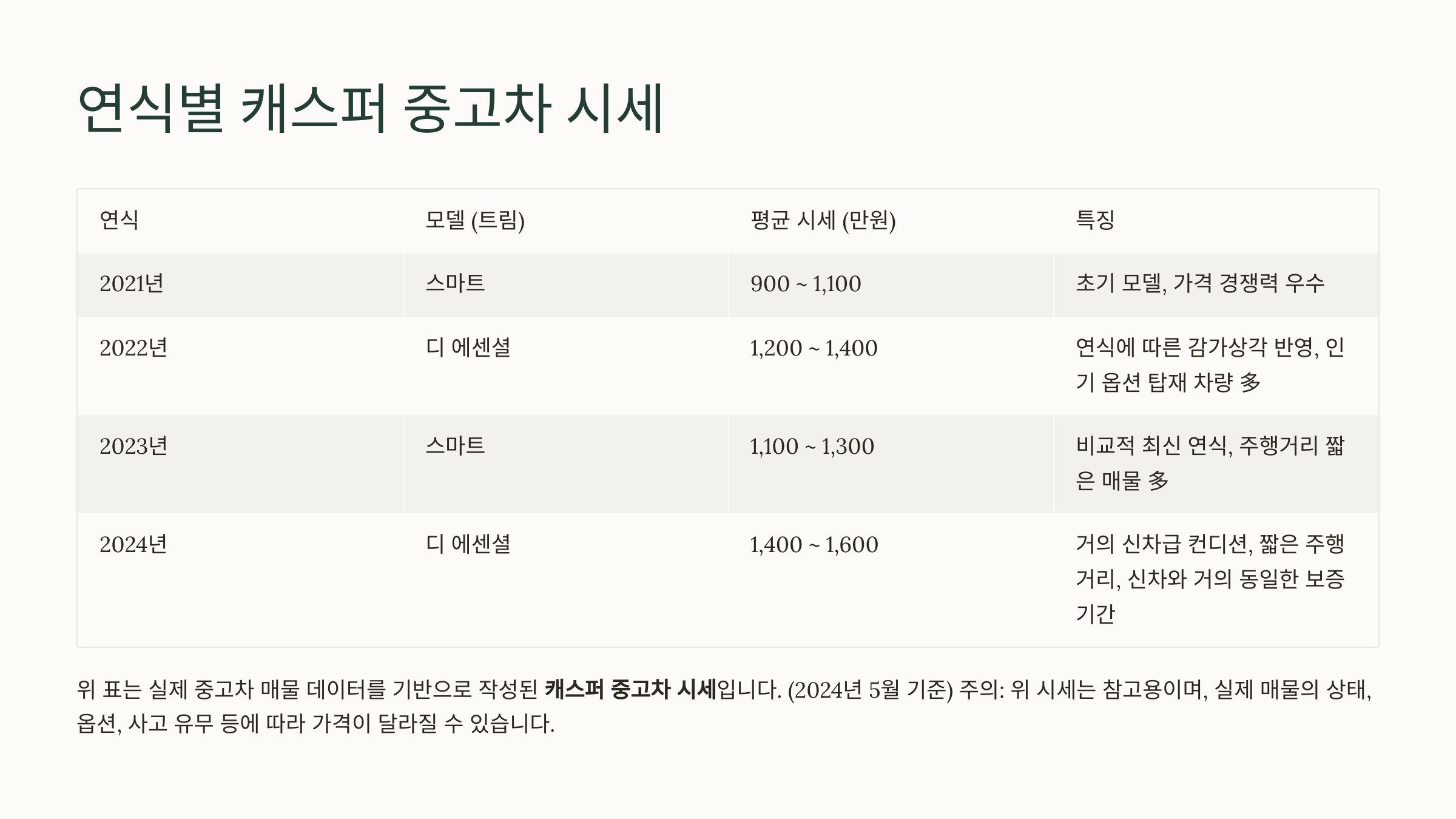 아래 표는 실제 중고차 매물 데이터를 기반으로 작성된 캐스퍼 중고차 시세입니다. (2024년 5월 기준)