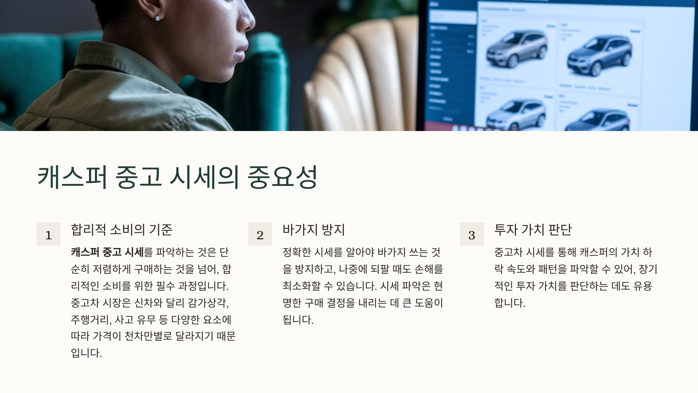 캐스퍼 중고 시세를 파악하는 것은 단순히 저렴하게 구매하는 것을 넘어, 합리적인 소비를 위한 필수 과정입니다. 중고차 시장은 신차와 달리 감가상각, 주행거리, 사고 유무 등 다양한 요소에 따라 가격이 천차만별로 달라지기 때문입니다. 정확한 시세를 알아야 바가지 쓰는 것을 방지하고, 나중에 되팔 때도 손해를 최소화할 수 있습니다.