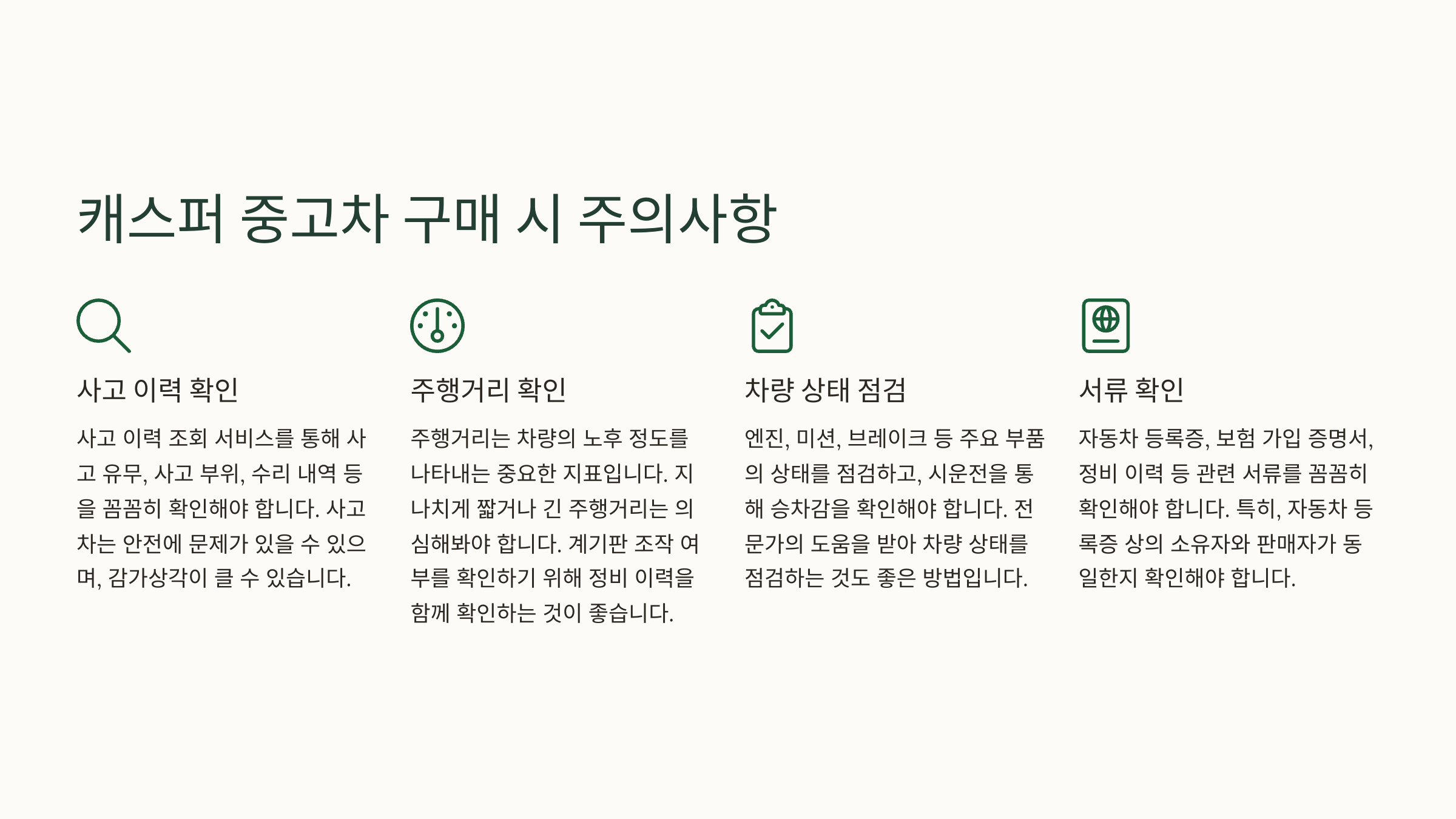 캐스퍼 중고차 구매 시에는 다음과 같은 사항을 주의해야 합니다.