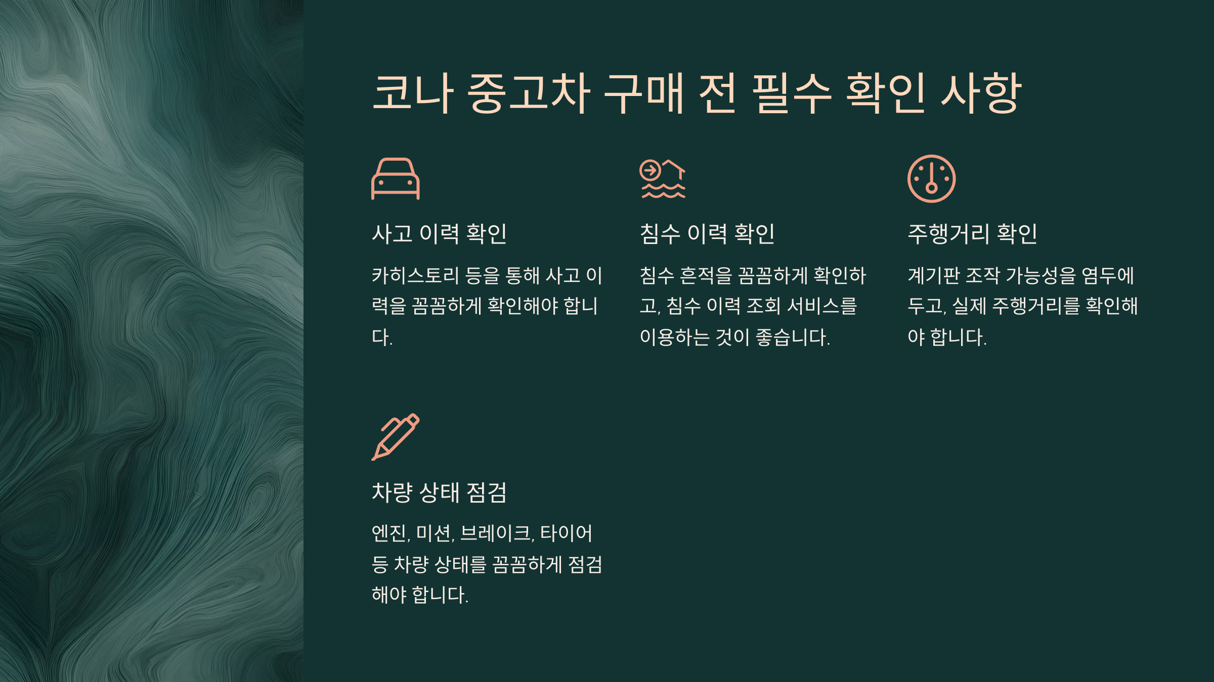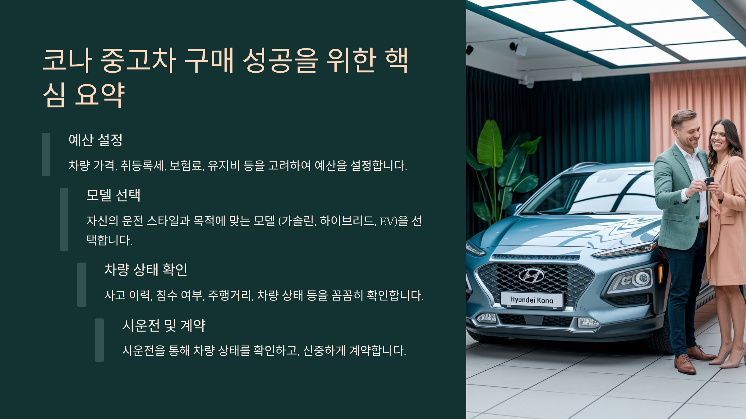 코나 중고차 구매 성공을 위한 핵심 요약입니다.
