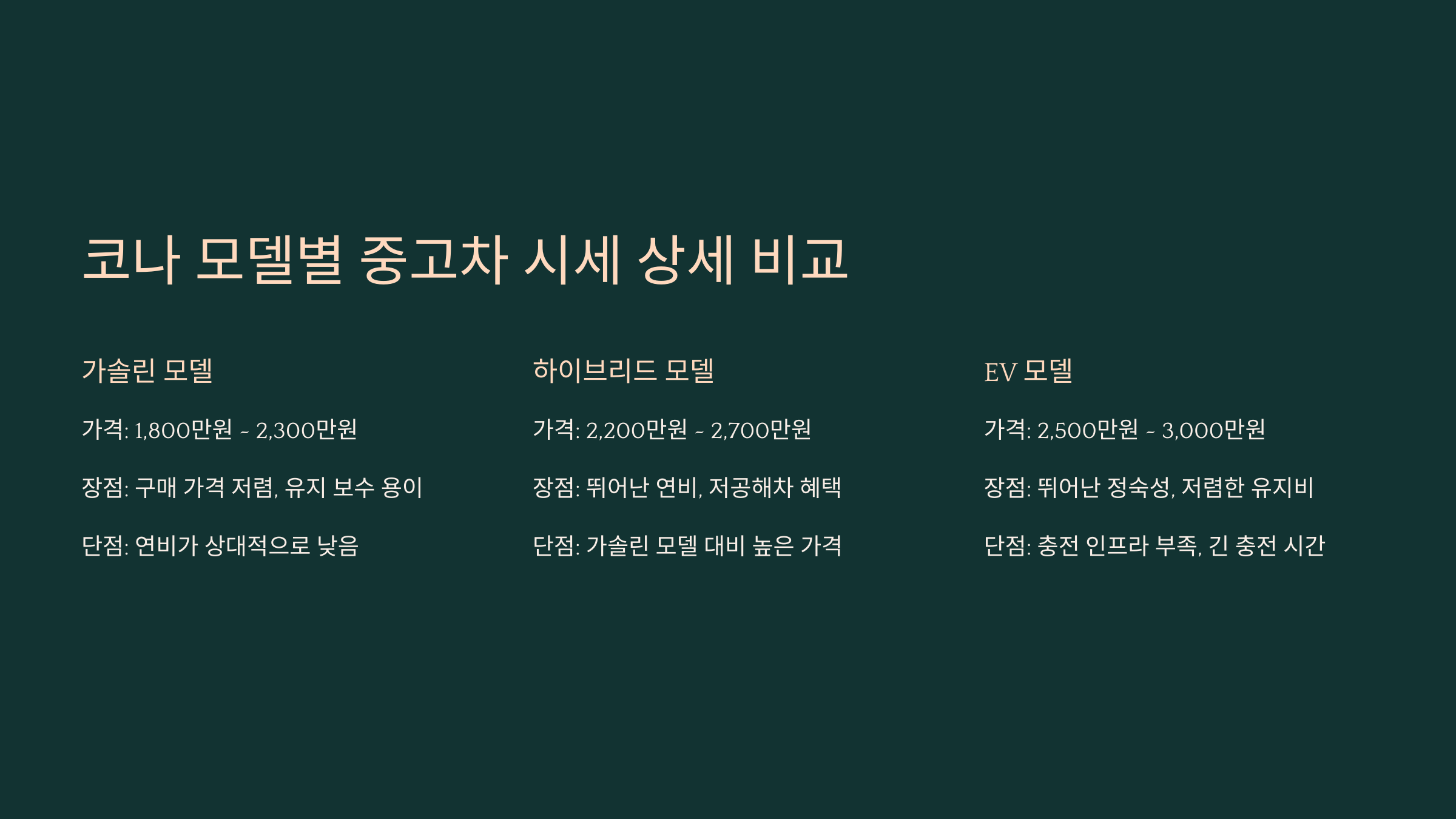 3. 코나 모델별 중고차 시세 상세 비교: 하이브리드 vs EV vs 가솔린