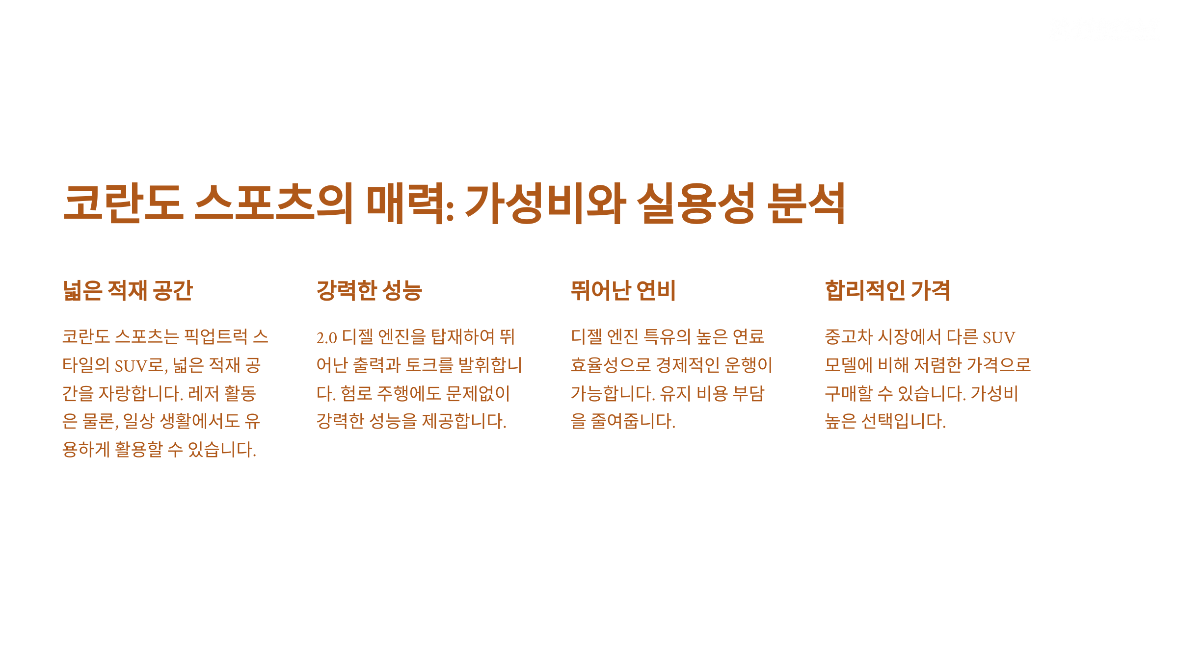 코란도 스포츠는 쌍용자동차(현 KG모빌리티)에서 생산한 픽업트럭으로, 뛰어난 공간 활용성과 합리적인 가격으로 꾸준한 인기를 얻었습니다. 특히 다음과 같은 장점 덕분에 중고차 시장에서도 매력적인 선택지로 꼽힙니다.