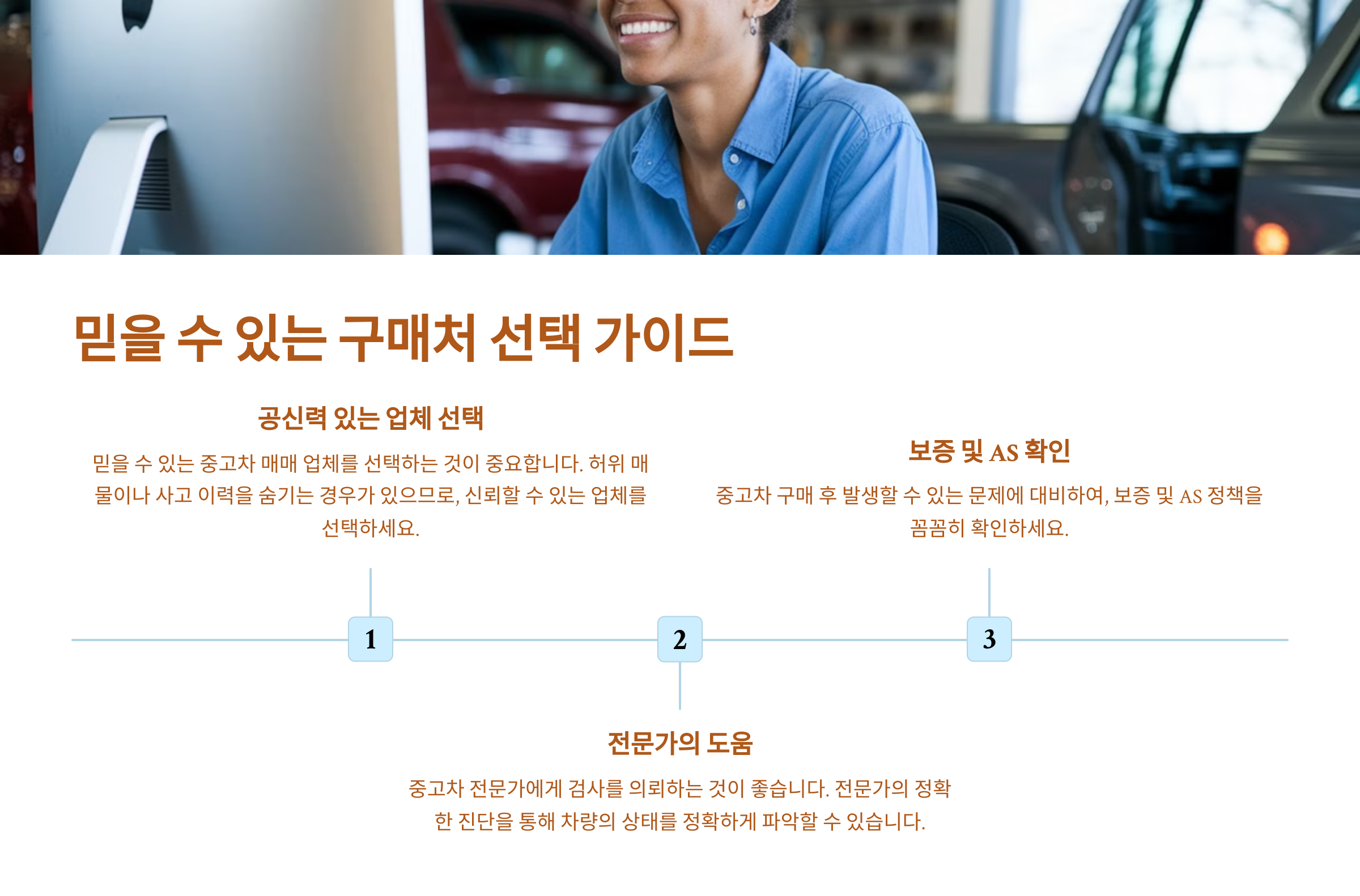 - 정비 이력 확인: 정기적인 정비 및 소모품 교환 이력을 확인하여 차량 관리 상태를 파악해야 합니다.