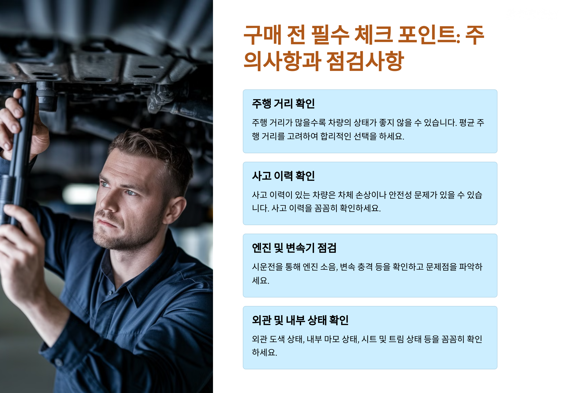 - 체크 포인트: 엔진 오일 누유, 미션 변속 충격, 하체 부식 등을 확인해야 합니다.