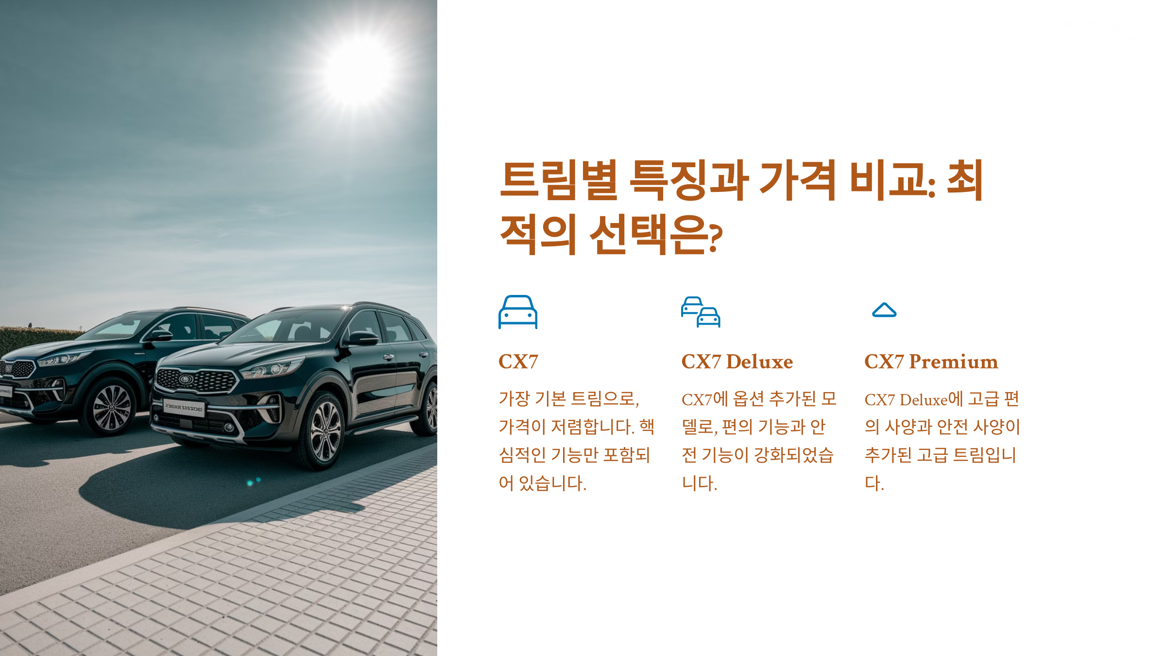 | CLUB | 최상위 모델로, 고급 편의 기능과 디자인 요소를 갖추고 있습니다. | 고급스러운 실내 디자인과 다양한 편의 기능을 누릴 수 있습니다. | CX5, CX7 모델 대비 가격이 가장 높습니다. |