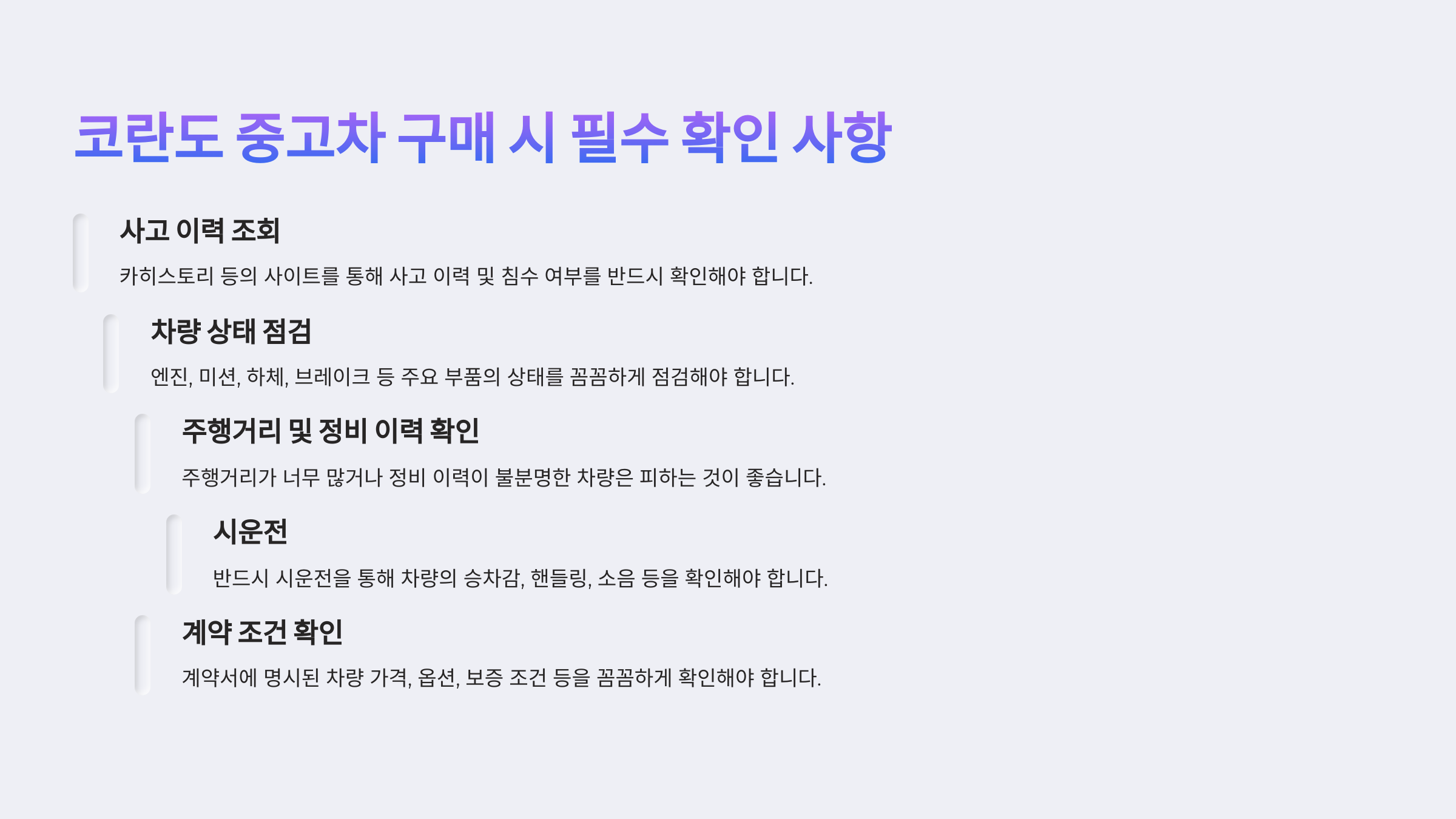 코란도 중고차를 구매하기 전에 반드시 확인해야 할 사항들을 정리했습니다.