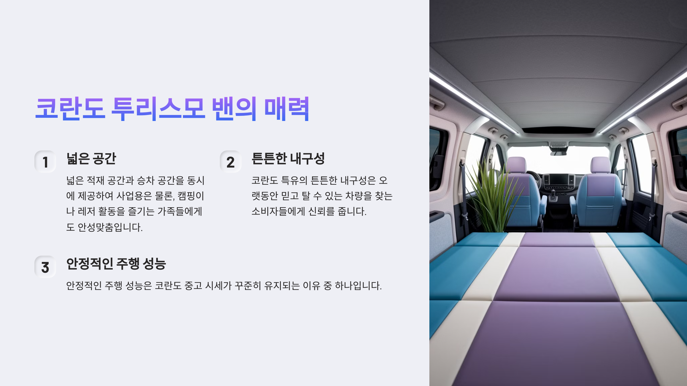 코란도 투리스모 밴은 넓은 적재 공간과 승차 공간을 동시에 제공하는 것이 가장 큰 장점입니다. 사업용은 물론, 캠핑이나 레저 활동을 즐기는 가족들에게도 안성맞춤입니다. 또한, 코란도 특유의 튼튼한 내구성과 안정적인 주행 성능은 오랫동안 믿고 탈 수 있는 차량을 찾는 소비자들에게 신뢰를 줍니다. 코란도 중고 시세가 꾸준히 유지되는 이유도 바로 이러한 실용성과 신뢰성 때문입니다.
