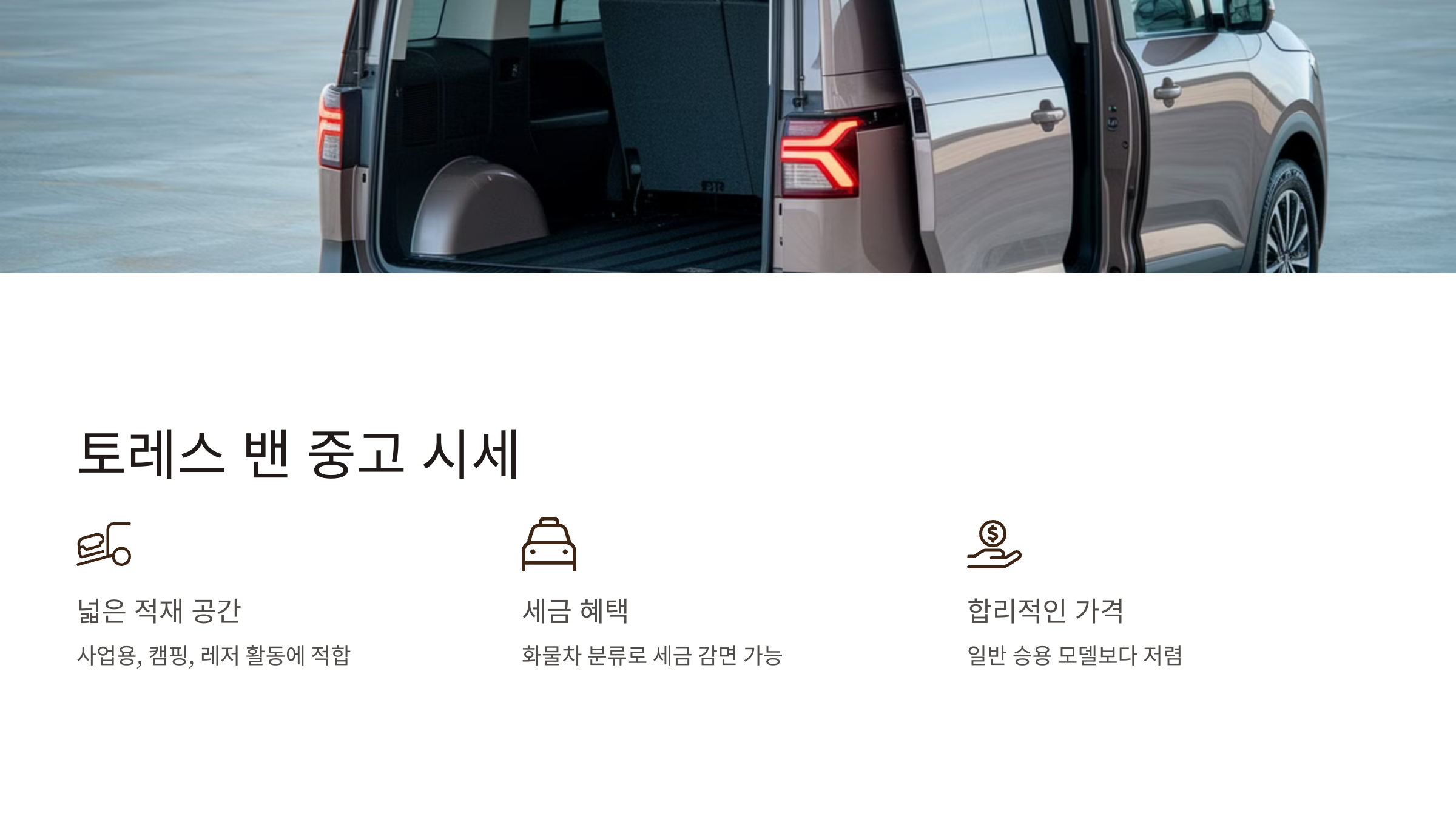 토레스 밴은 넓은 적재 공간과 실용적인 디자인으로 사업자뿐만 아니라 개인에게도 유용한 차량입니다. 중고차 시장에서는 화물차로 분류되어 세금 혜택을 받을 수 있다는 장점이 있습니다.