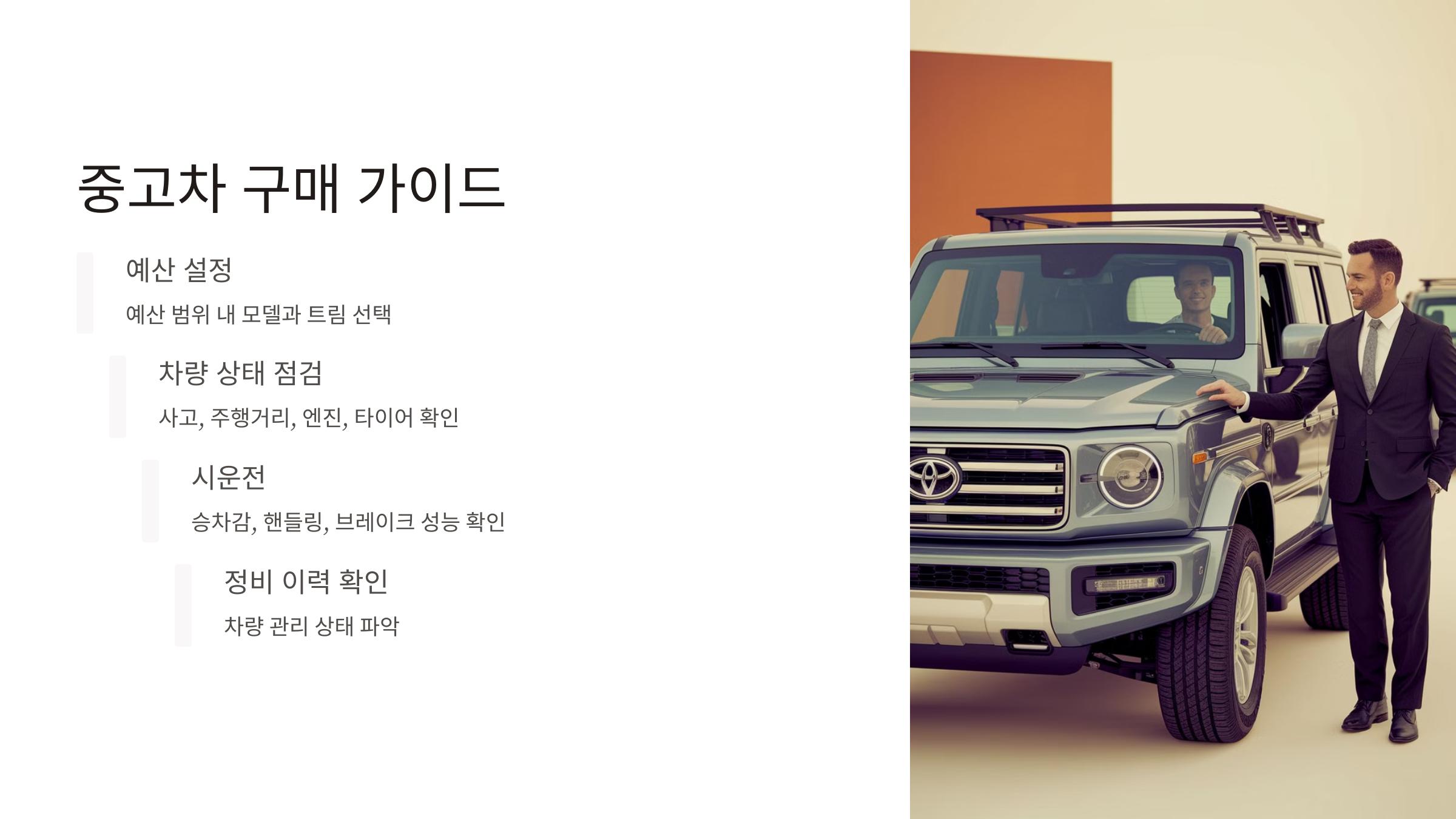 - 전문가 도움: 필요하다면 중고차 전문가의 도움을 받아 차량 상태를 점검하고, 적정 가격을 협상합니다.