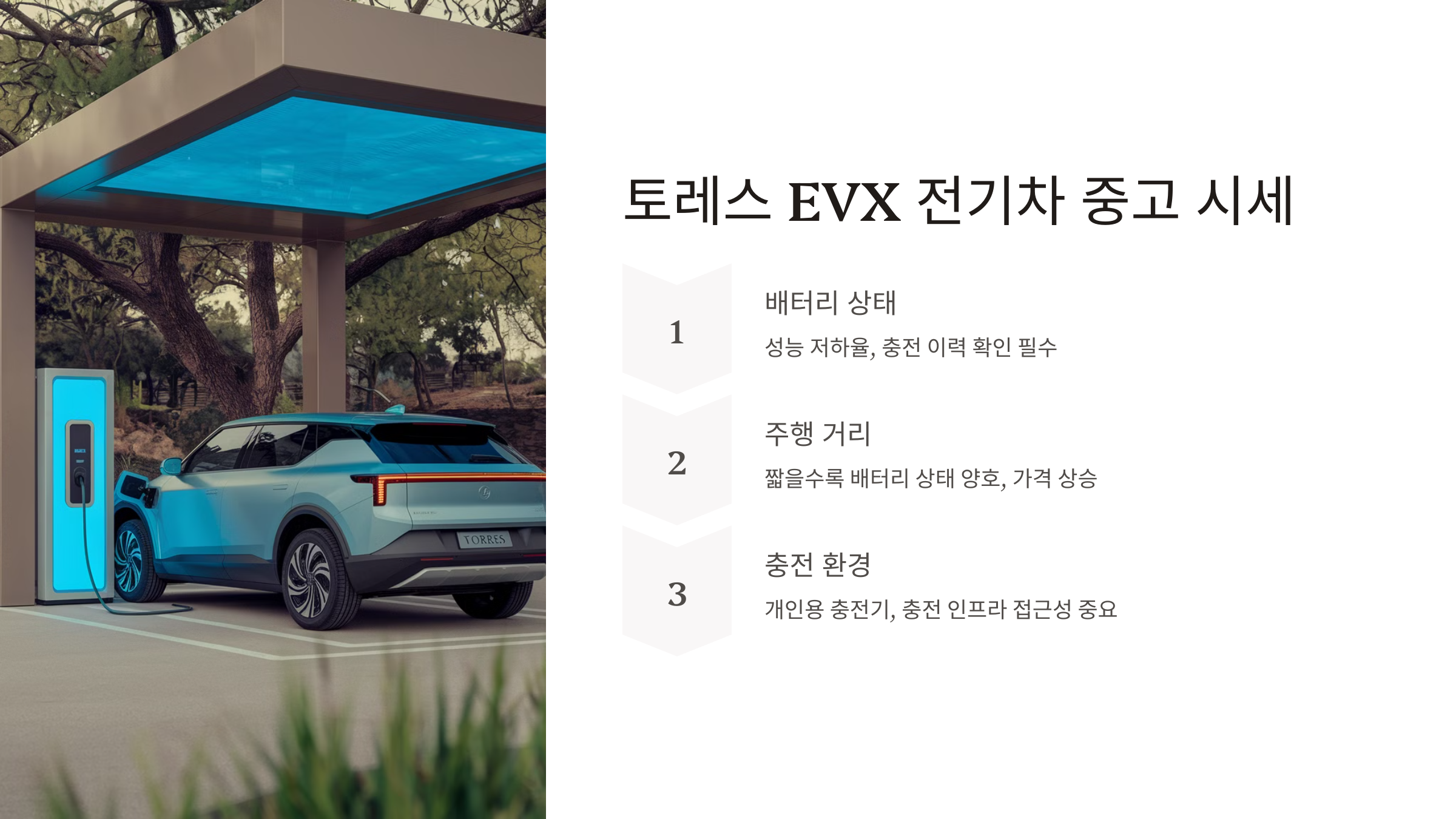 토레스 EVX는 뛰어난 성능과 긴 주행 거리로 전기차 시장에서 주목받고 있습니다. 중고차 시장에서도 EVX의 인기는 높으며, 친환경적인 선택을 고려하는 소비자들에게 매력적인 대안이 될 수 있습니다.