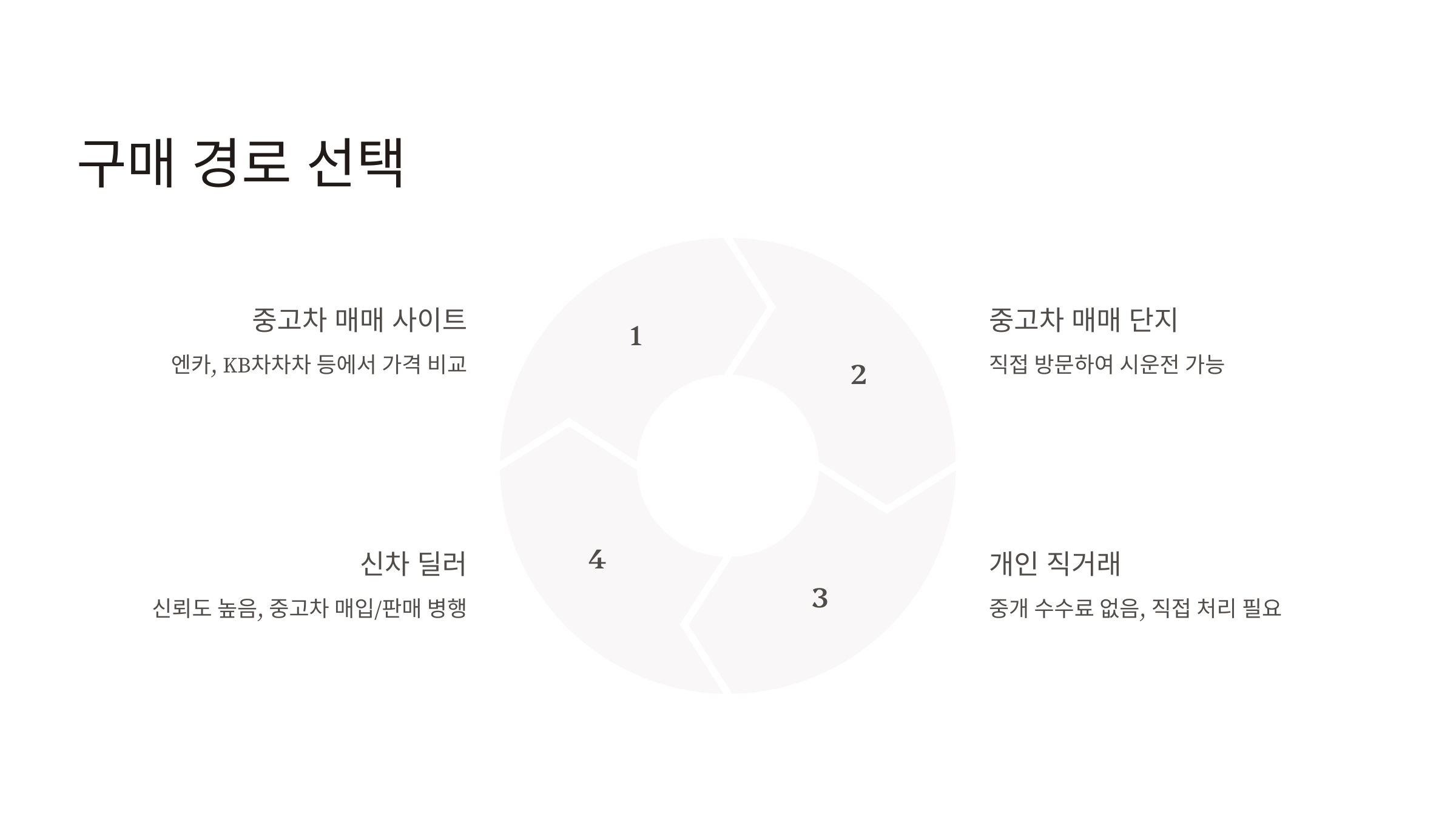 - 중고차 매매 단지: 직접 매매 단지를 방문하여 다양한 차량을 직접 보고, 시운전할 수 있습니다.