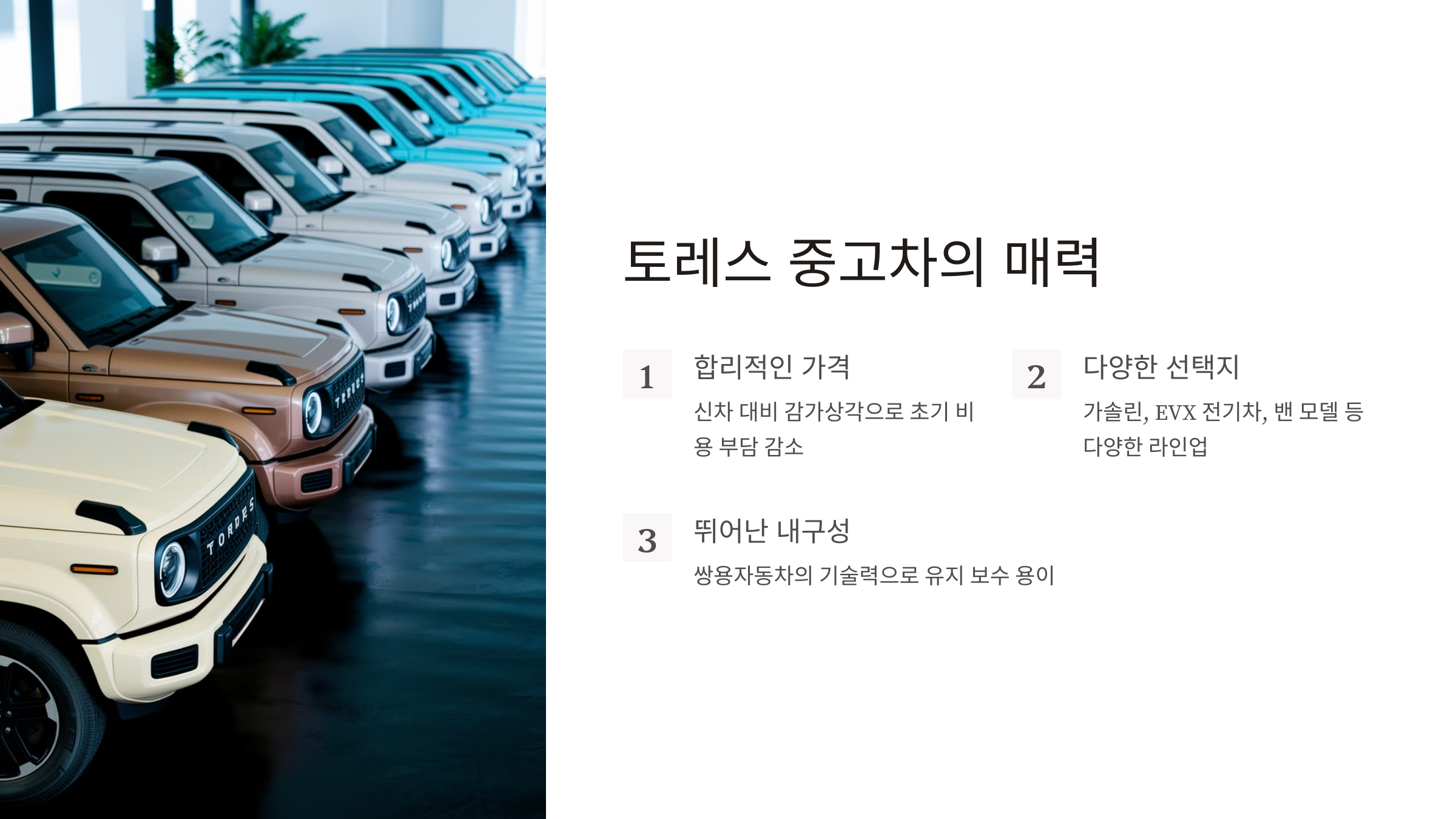 토레스는 가솔린 모델부터 EVX 전기차, 밴 모델까지 다양한 라인업을 갖추고 있어 선택의 폭이 넓습니다. 중고차 시장에서는 신차 대비 감가상각이 이루어져 더욱 합리적인 가격으로 구매할 수 있다는 장점이 있습니다. 특히 토레스는 내구성이 뛰어나고 유지 보수가 용이하여 중고차로서도 매력적인 선택지가 됩니다.