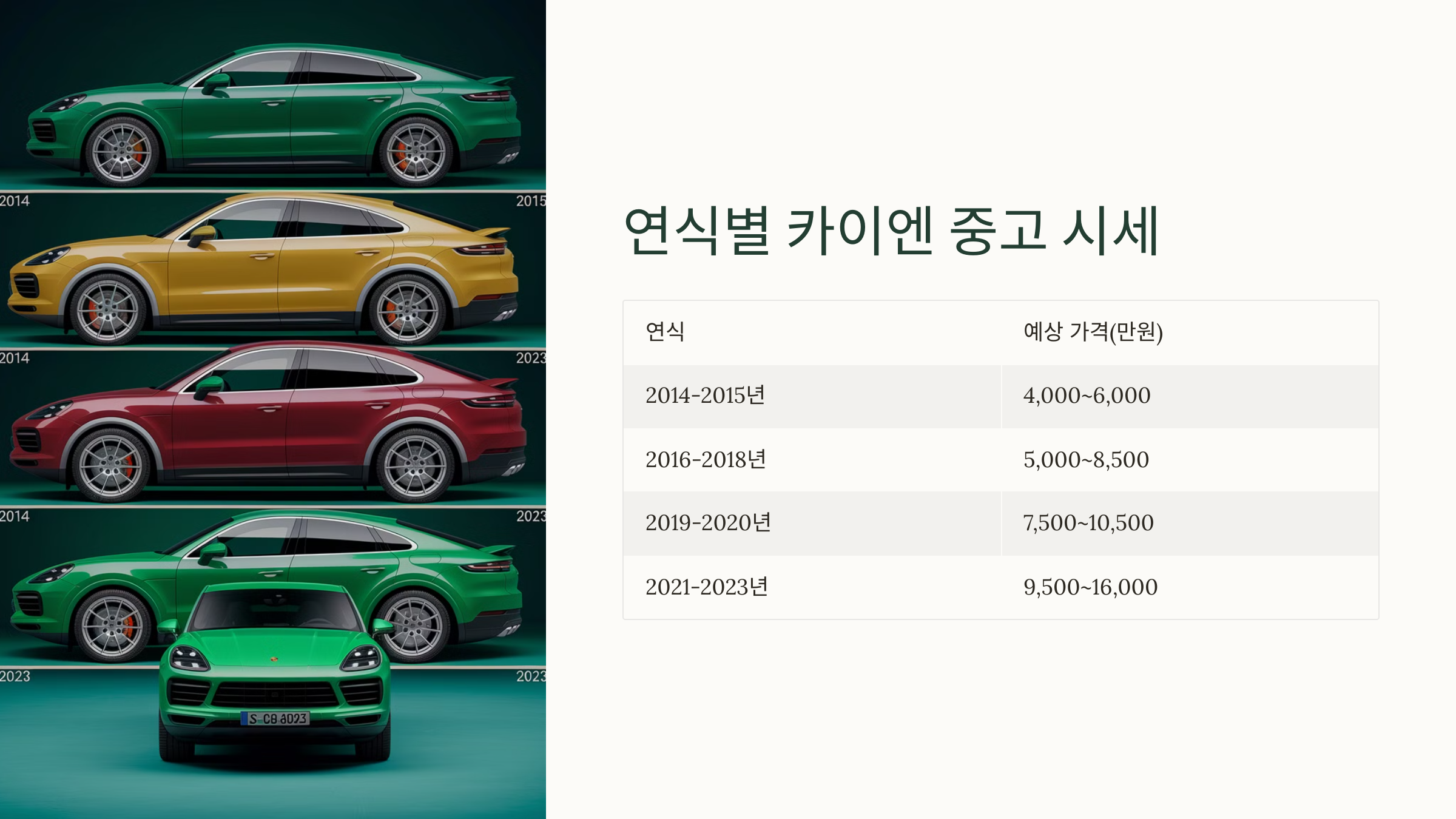 다음은 최근 10년간 포르쉐 카이엔의 연식별 중고차 시세표입니다. 해당 시세는 일반적인 기준으로 작성되었으며, 실제 거래 가격은 차량 상태, 옵션, 사고 이력 등에 따라 달라질 수 있습니다.
