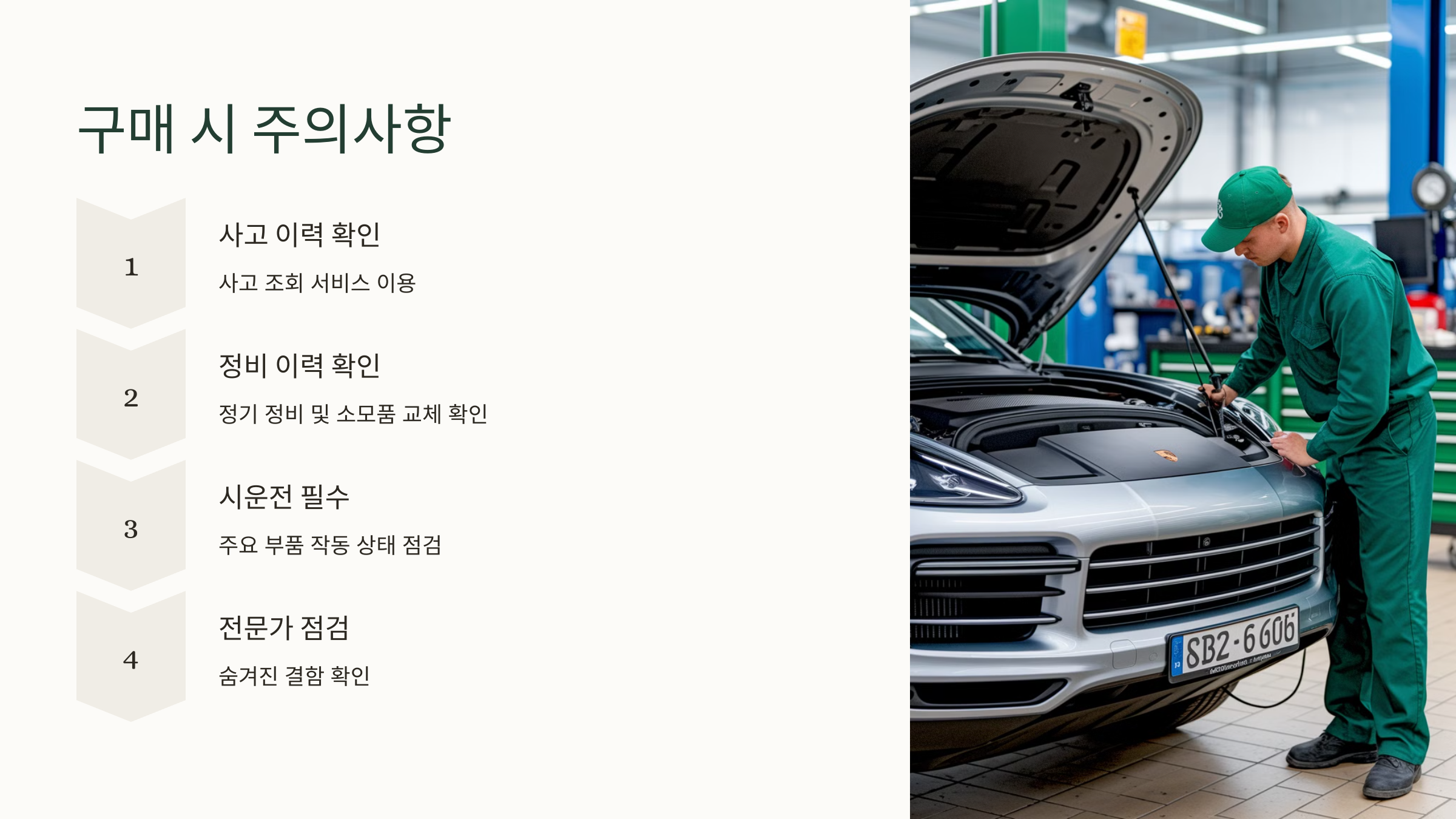 포르쉐 카이엔 중고차를 구매할 때는 다음과 같은 사항들을 주의해야 합니다.