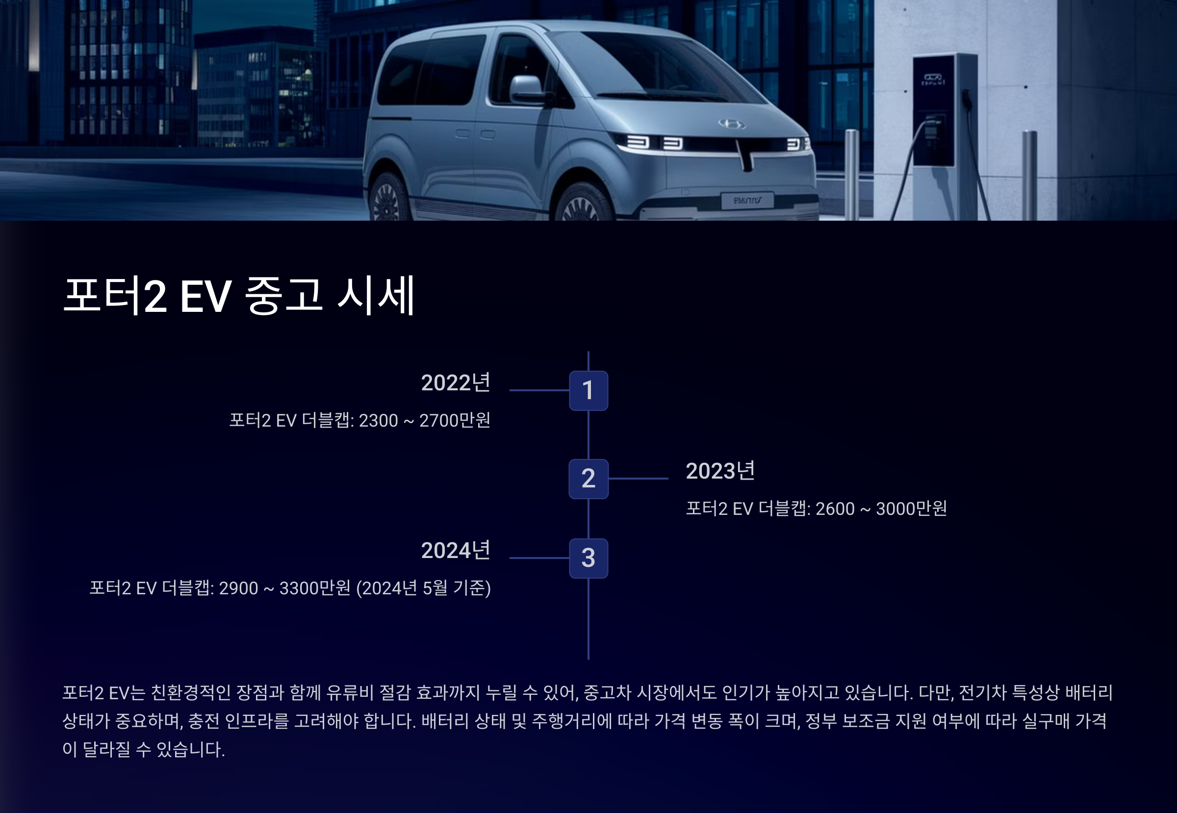 | 2024년 | 포터2 EV 더블캡 | 2900 ~ 3300 | (2024년 5월 기준), 신차급 매물이 많음 |