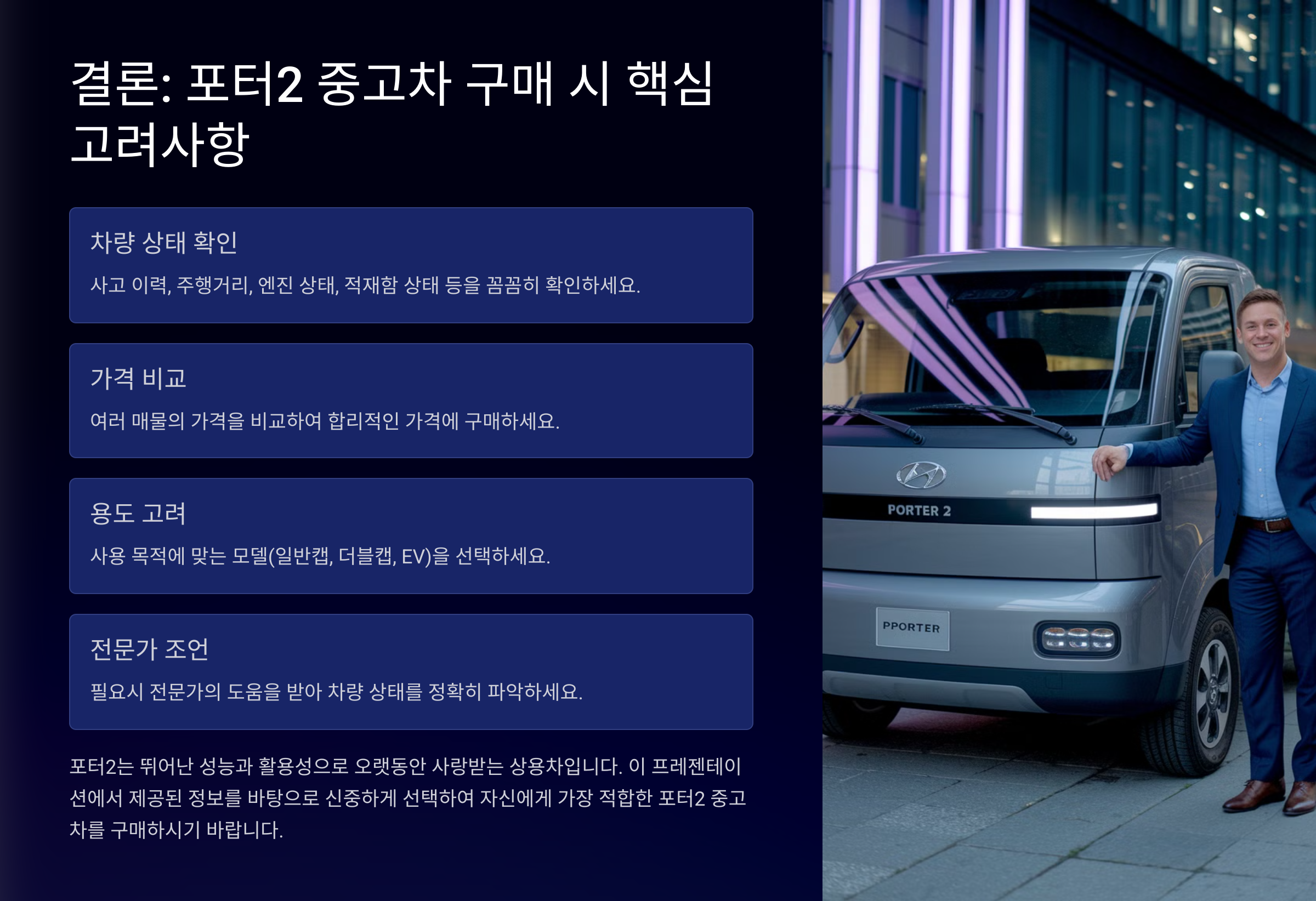 포터2는 뛰어난 성능과 활용성으로 오랫동안 사랑받는 상용차입니다. 중고차 시장에서도 꾸준한 인기를 누리고 있으며, 특히 EV 모델은 친환경적인 장점까지 더해져 더욱 많은 관심을 받고 있습니다. 이 글에서 제시된 정보를 바탕으로 꼼꼼하게 차량 상태를 확인하고, 합리적인 가격으로 포터2 중고차를 구매하시기 바랍니다.