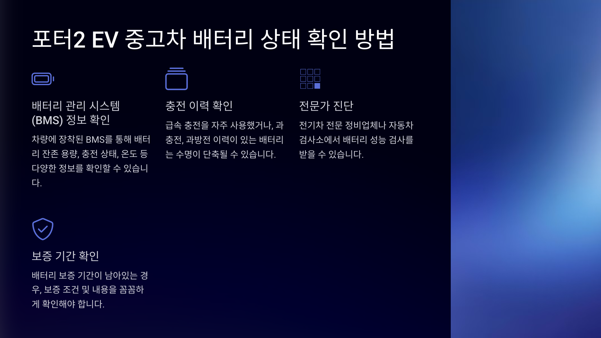 포터2 EV 중고차, 배터리 상태 확인하는 방법