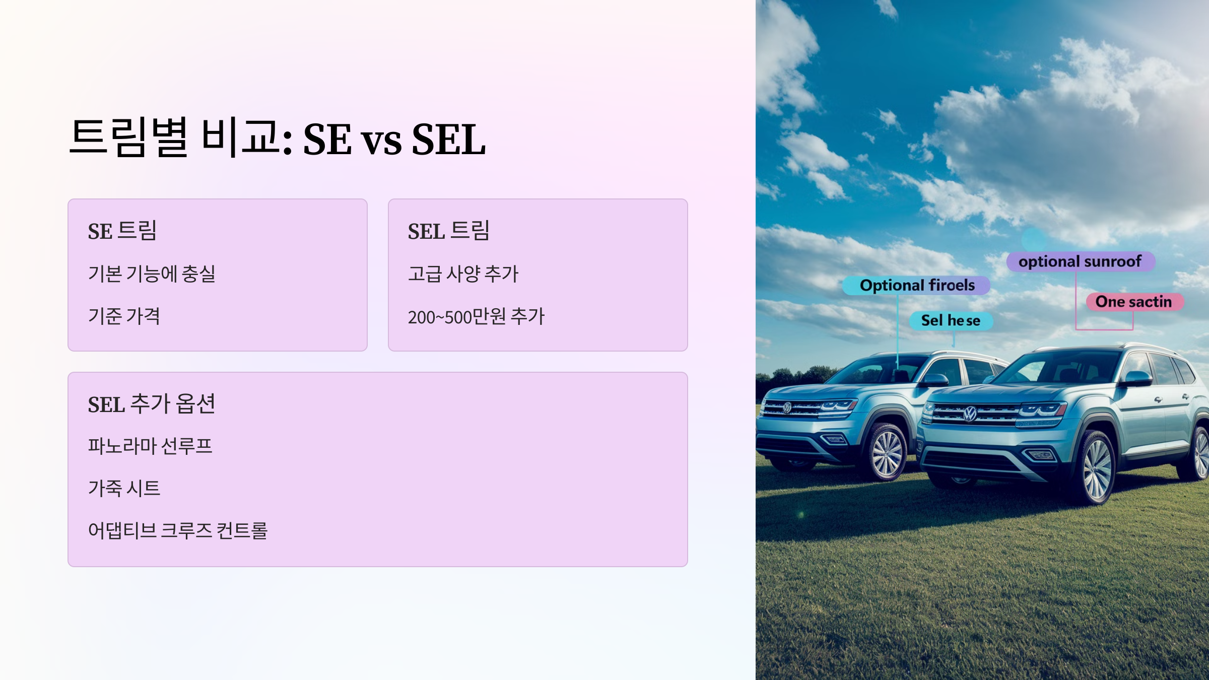 | SEL | - 파노라마 선루프, 가죽 시트, 어댑티브 크루즈 컨트롤, 프리미엄 오디오 시스템 등 고급 사양 추가 | +200 ~ +500 |