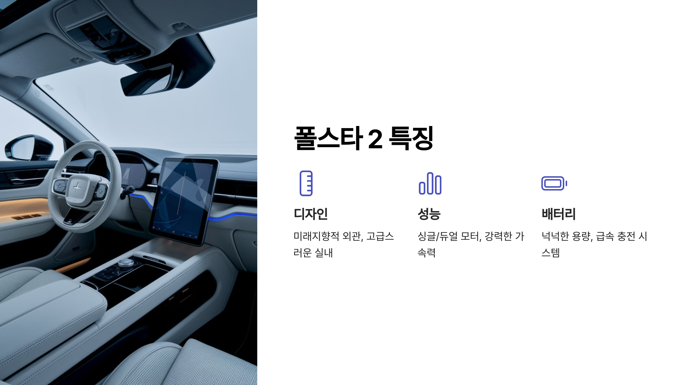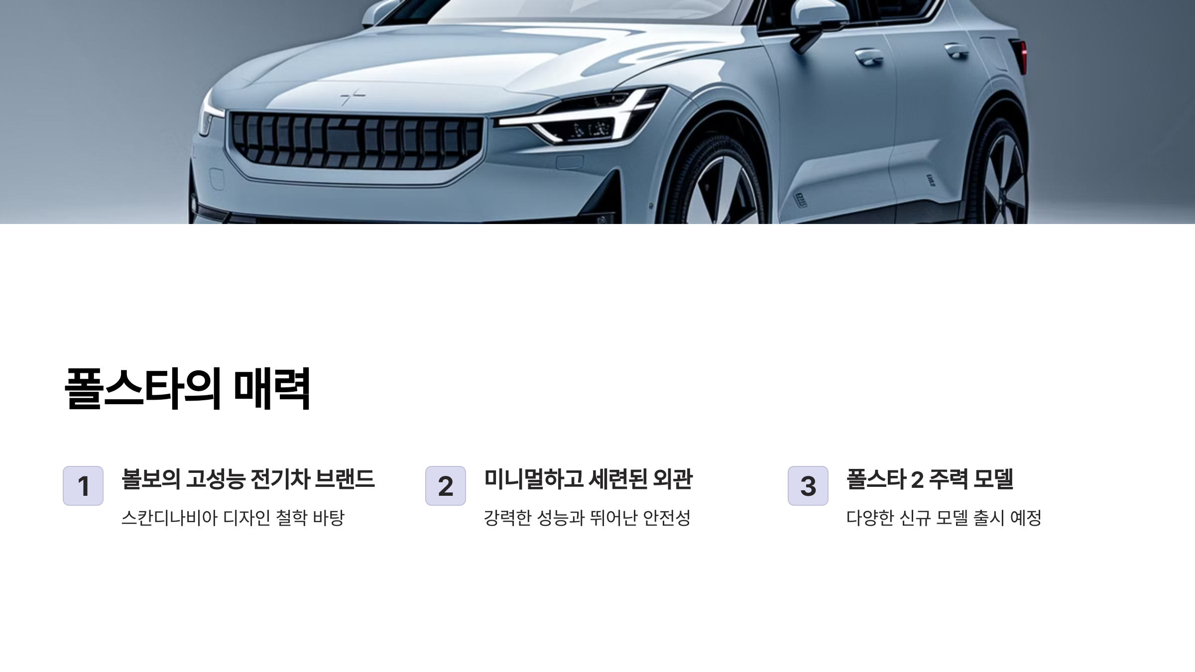 폴스타는 볼보자동차의 고성능 전기차 브랜드로, 스칸디나비아 디자인 철학을 바탕으로 미니멀하면서도 세련된 외관을 자랑합니다. 강력한 성능과 뛰어난 안전성, 그리고 첨단 기술까지 더해져 많은 사랑을 받고 있죠. 현재 폴스타는 폴스타 2를 주력 모델로 판매하고 있으며, 앞으로 다양한 모델을 출시할 예정입니다.