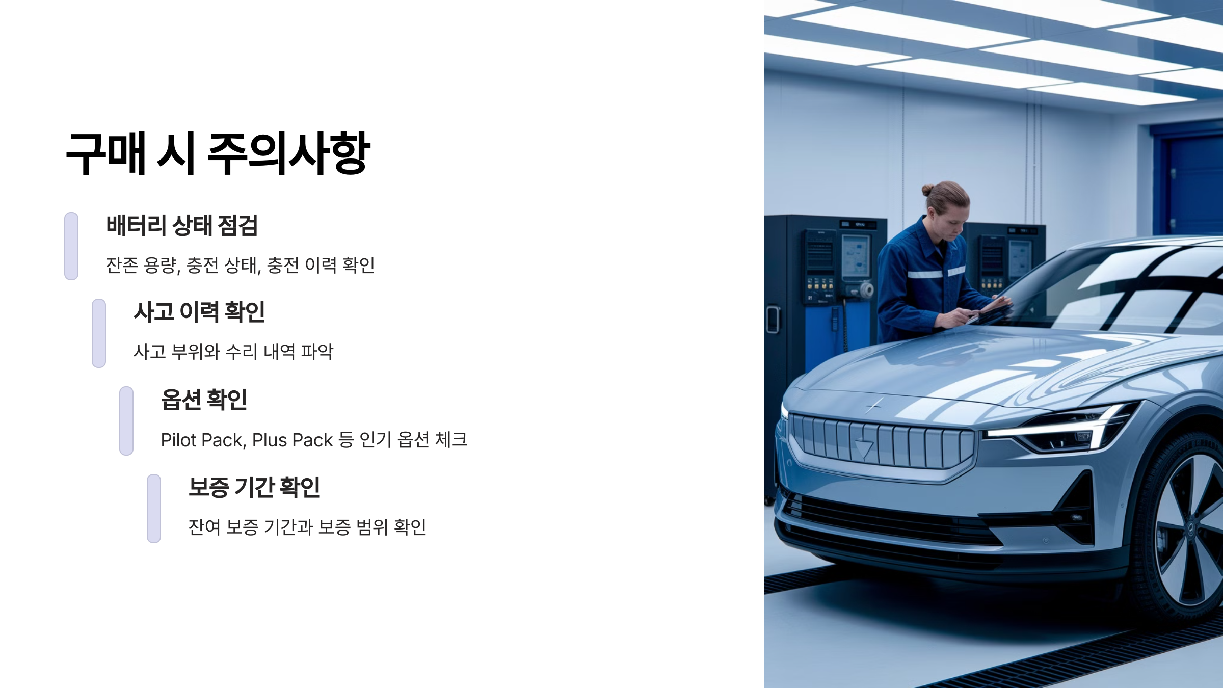 폴스타 중고차를 구매할 때는 다음과 같은 사항에 유의해야 합니다.
