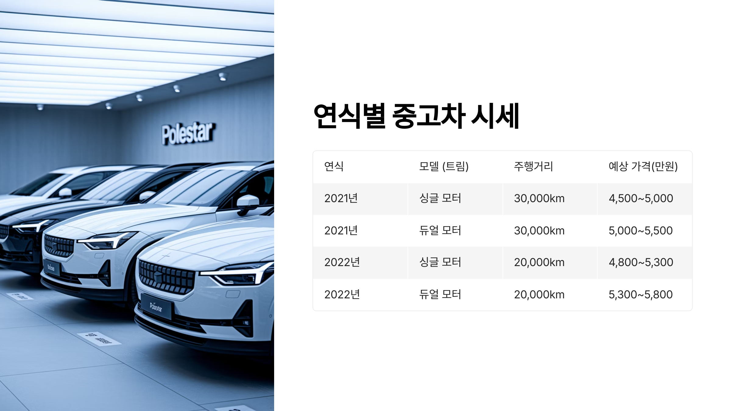 폴스타 2는 2021년부터 국내에 판매되기 시작했으므로, 중고차 시장에서도 비교적 최신 연식의 매물을 찾을 수 있습니다. 다음 표는 연식별 폴스타 2 중고차 시세를 나타냅니다.