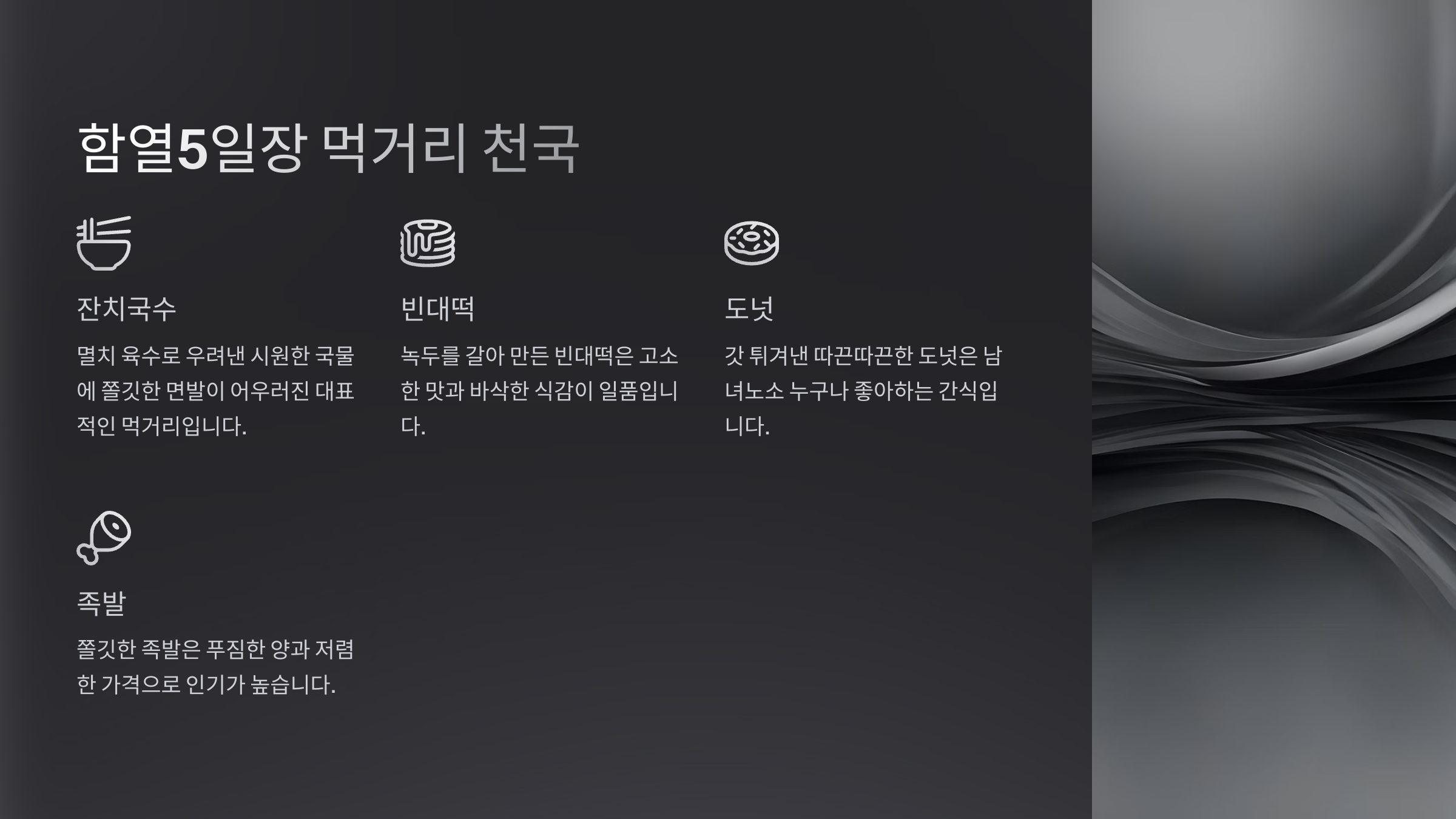 - 잔치국수: 멸치 육수로 우려낸 시원한 국물에 쫄깃한 면발이 어우러진 잔치국수는 함열장날의 대표적인 먹거리입니다. 뜨끈한 국물 한 그릇이면 추위도 잊게 됩니다.