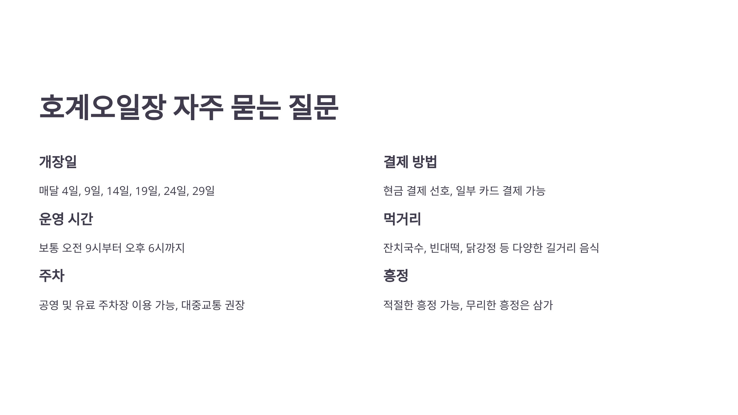 A: 카드 결제가 가능한 곳도 있지만, 대부분의 상인들은 현금 결제를 선호합니다. 현금을 넉넉히 준비하는 것이 좋습니다. - Q: 호계장날에서 어떤 먹거리를 맛볼 수 있나요?