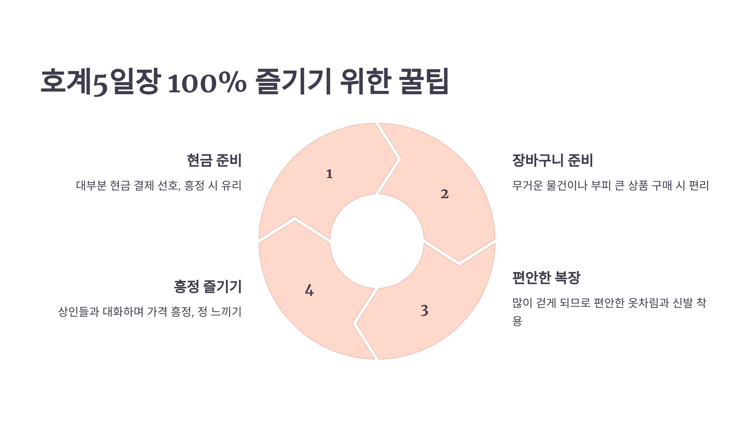 호계장날을 더욱 알차고 즐겁게 즐기기 위한 몇 가지 꿀팁을 소개합니다. 미리 준비하고 가면 더욱 편리하고 즐거운 시간을 보낼 수 있습니다.